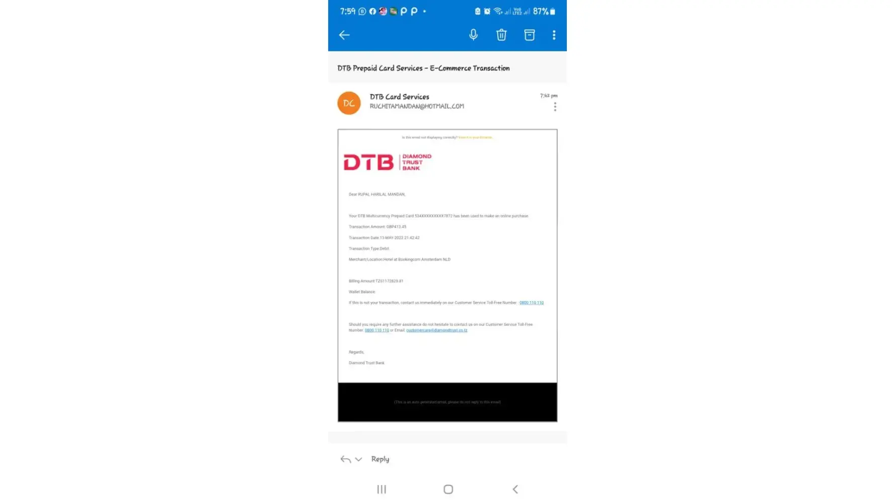 Booking.com I was scammed and charged gbp 413.45 on 13th may, 2022 for the hotel reservation service which I have not used.