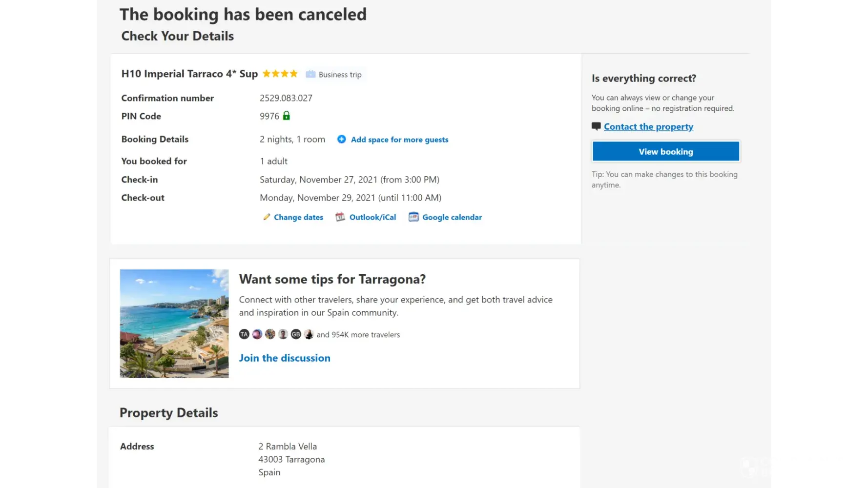 I books the H10 Hotel Tarragona and canceled (to reschedule for longer stay). November 26, 2021 cancelation was more that 3 days before check-in. When I arrived the hotel said I was a no show and charge me one night for cancelation. I contact Booking.com, a case was assigned and provided them all the email correspondence between them with the cancelation and rebooking.