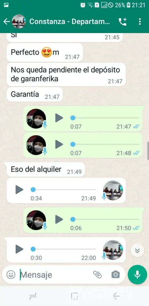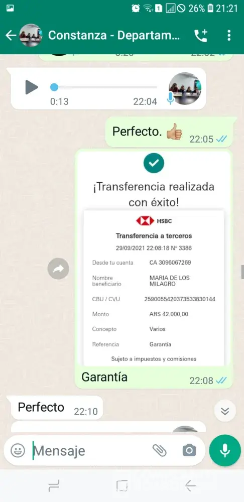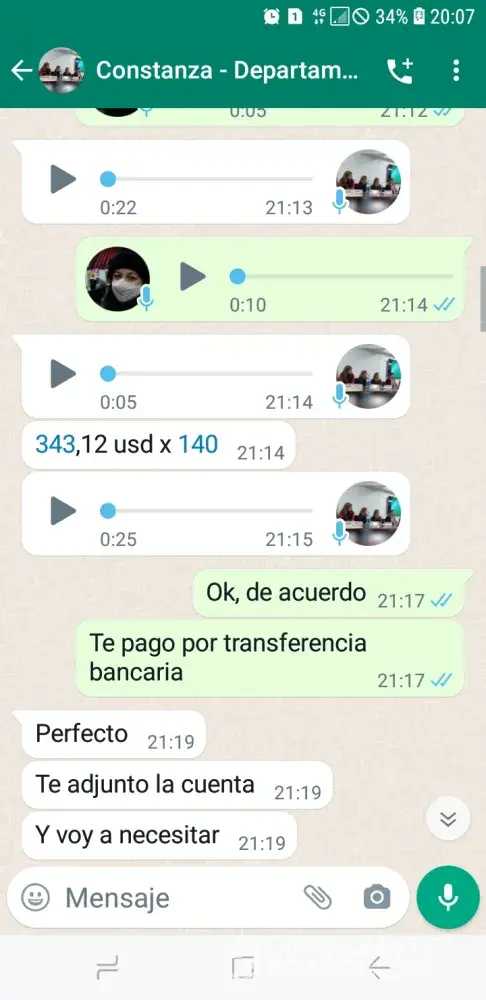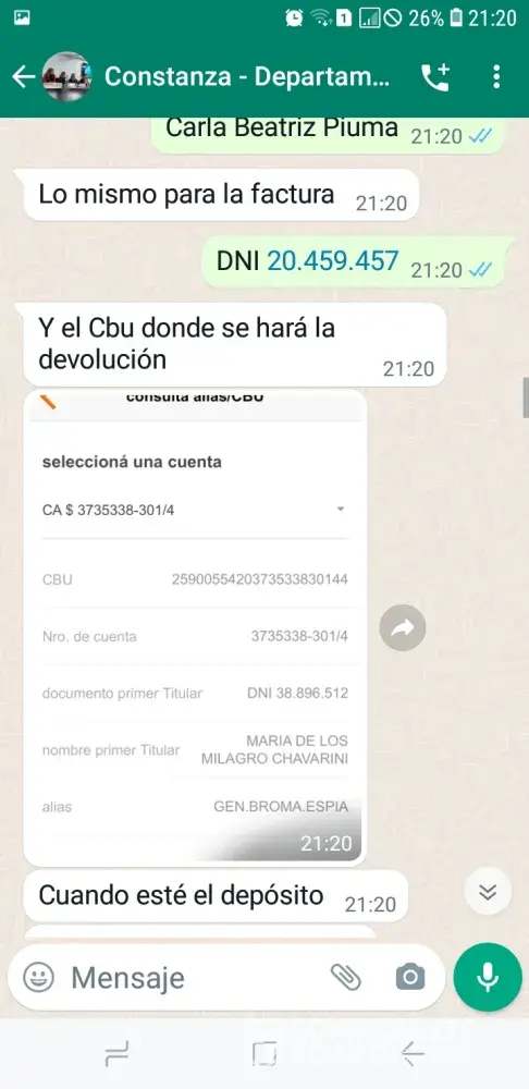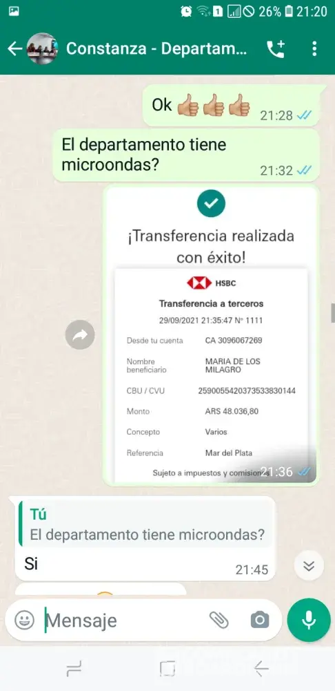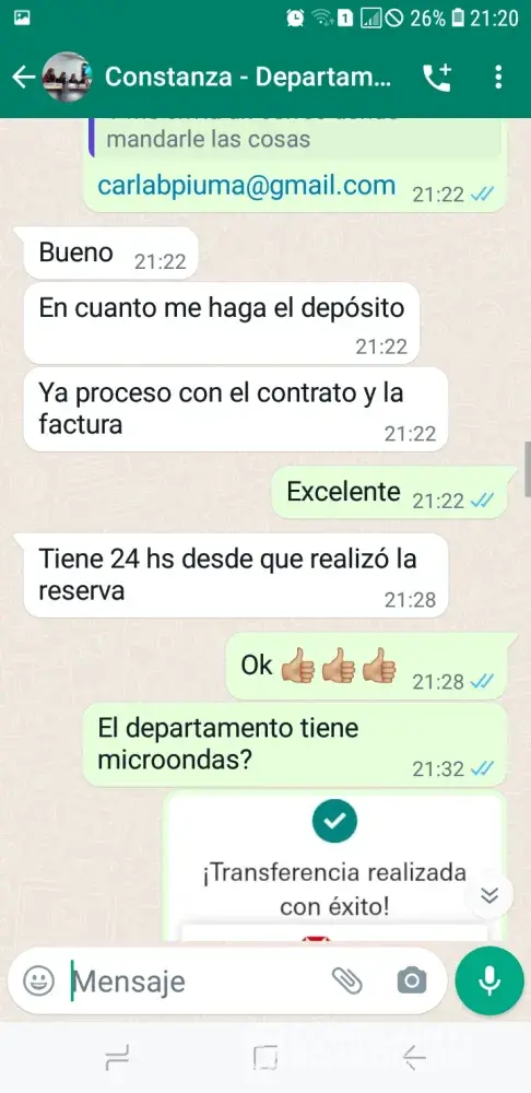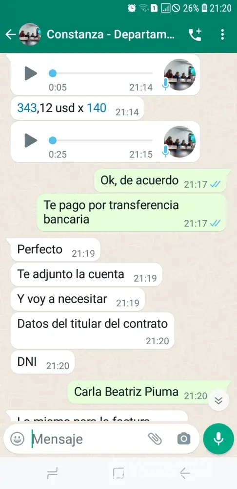 When I arrived with my family at Mar del Plata to the address she gave me to get the apartment key, the local simply did not exist. I was a scam. She blocked me in WhatsApp and I was never able to contact her again.