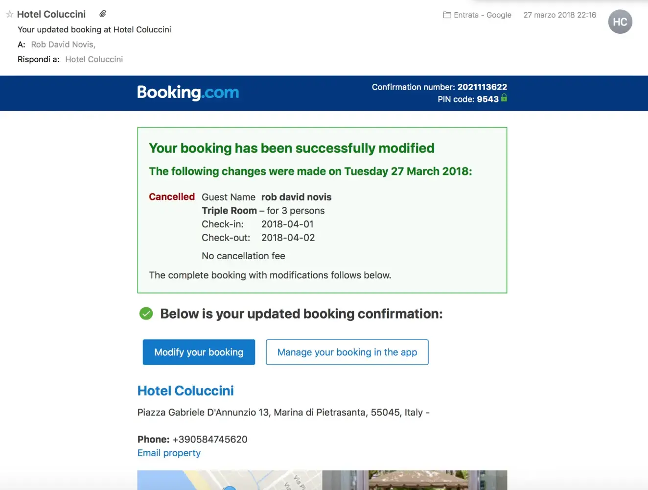 I booked two rooms in Pietrasanta (Italy) on March 27th (One for me and my family and one for our friends) for April 1st and 2nd and then read that it would only be possible to cancel the rooms 4 days before arrival, so I had to cancel the same night or they would have taken the entire amount. I proceeded to cancel the room. I received a message saying that the booking had been modified and that my room was cancelled. My friend then booked another room on booking. I received a message on my phone the morning of our trip that they had charged me 133 euros on my credit card. So what happened is that they had cancelled my booking, but they didn't cancel my friend's so I was charged for that. It was written in the email, but it was not clear at all and I would say that it's somewhat of a scam because there was only one confirmation number so once I read that the booking was cancelled I was assured that I no longer had to pay. I called the hotel which was really rude to us, and they only offered to let us stay in their hotel for 90 euros instead of 133 after they received a phone call from Booking customer care, which for me is unacceptable. I think Booking should refund me because of their misleading email. Only if you read the fine print of the email can you understand that only part of the booking was cancelled.