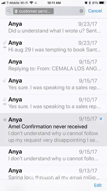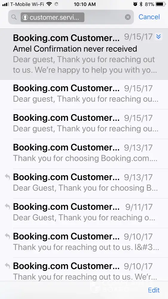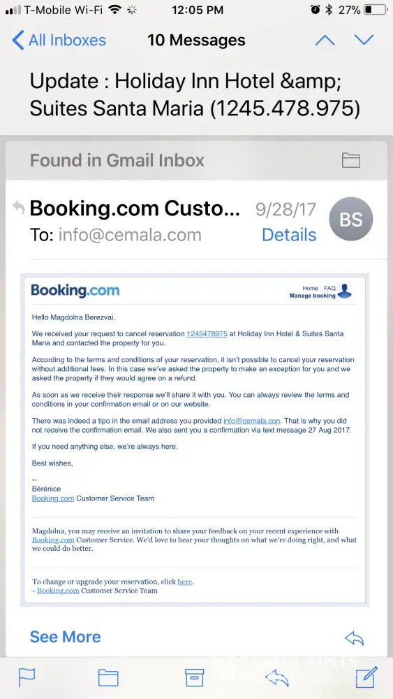 I gave up on sending emails to booking.com because they never answered to my 10 emails since October. It was not even rude or offensive. so I called booking.com And the person told me that I have to deal with the hotel that charged. Well booking.com never sent me the confirmation and Amel the very first person I talked to told me that because the email address was spelled wrong [protected]@cenala.com and not [protected]@cemala.com and it had BOUNCED back so that's why I NEVER RECEIVED IT.