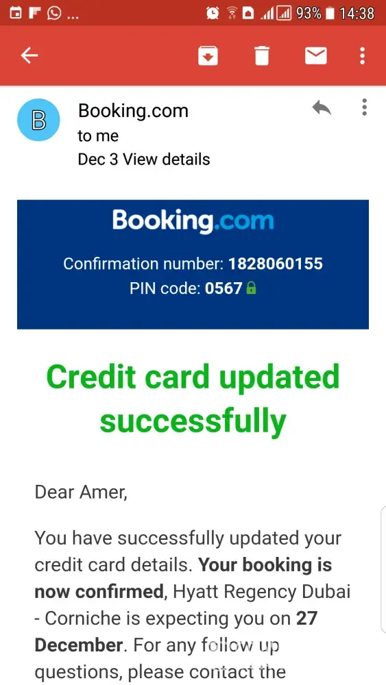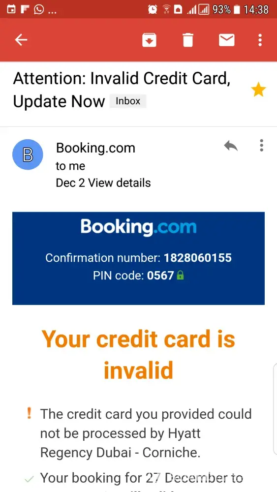 I made a reservation throw Booking.com by end of Sep, 2017 for the new year eve in Dubai at Hyatt regency hotel for 10 days, at that time the price was 3300$ for 2 rooms 3 adults 2 child, at the 2nd of Dec, I got an email from booking.com telling me that (you credit card is invalid) update or add new one, so I provide them with new credit card, 3rd of Dec, I get an email (credit card update successfully), at 8th of Dec, got an email from Hyatt regency says that my reservation was cancelled because of an invalid credit card, at this time the hotels prices were very high double or treble, and I had to make another reservation at another hotel because I was already bought the airplane tickets, and I pied for the new reservation 6000 $, at 10th of Dec, I got a massage from my bank with the first credit card says that I was charged 3000$ and I don't know way!