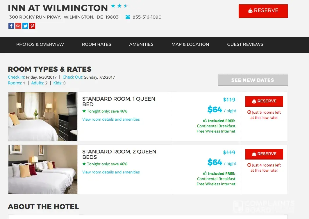 I was tricked into thinking I was confirming a low rate on Booking.com's website. On Monday, 6/26/17, the booking.com website listed a rate of $64.48 per night for a stay at the Inn At Wilmington for two nights: check in 6/30-check out 7/2. They have an intrusive sidebar pushing other travel-related deals on their "Reserve" page. Of course I clicked the "x" to get rid of it to see the rates suggested. Once you click the "reserve" button, again it's a new screen with the same pop up sidebar. I clicked the "X" again without care--there it showed in small type that my $64.48 rate was actually $119 plus fees. no where else on the page! When I clicked "confirm payment" it jumped me to a screen that showed $286 had been charged to my credit card. I called immediately to cancel. They informed me that I would be charged $14.99 for the privilege of using their sneakily deceptive site. The customer service rep, clearly on a word track, did nothing but let me know that my refund, light $14.99, would probably show up in 7-10 days.