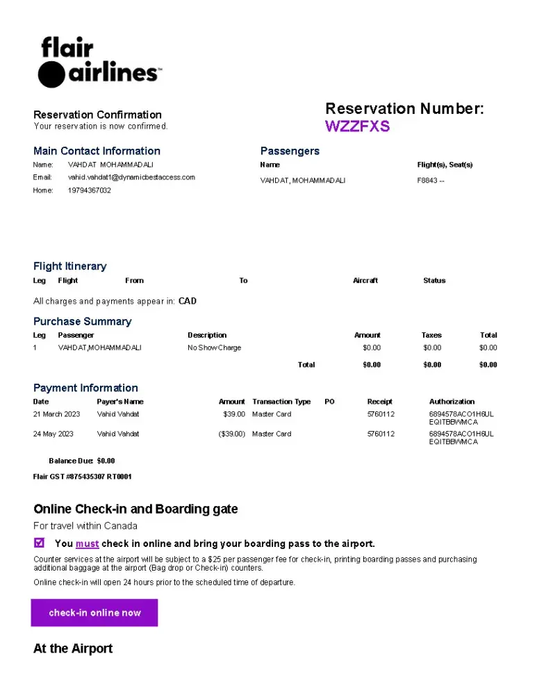 My name is Vahid Vahdat and I am filing this complaint because Booking.com, an online travel agency, which is a subsidiary of Booking Holdings, refuses to reimburse expenses that it has already received on my behalf from a travel airline, called Flair Airlines.