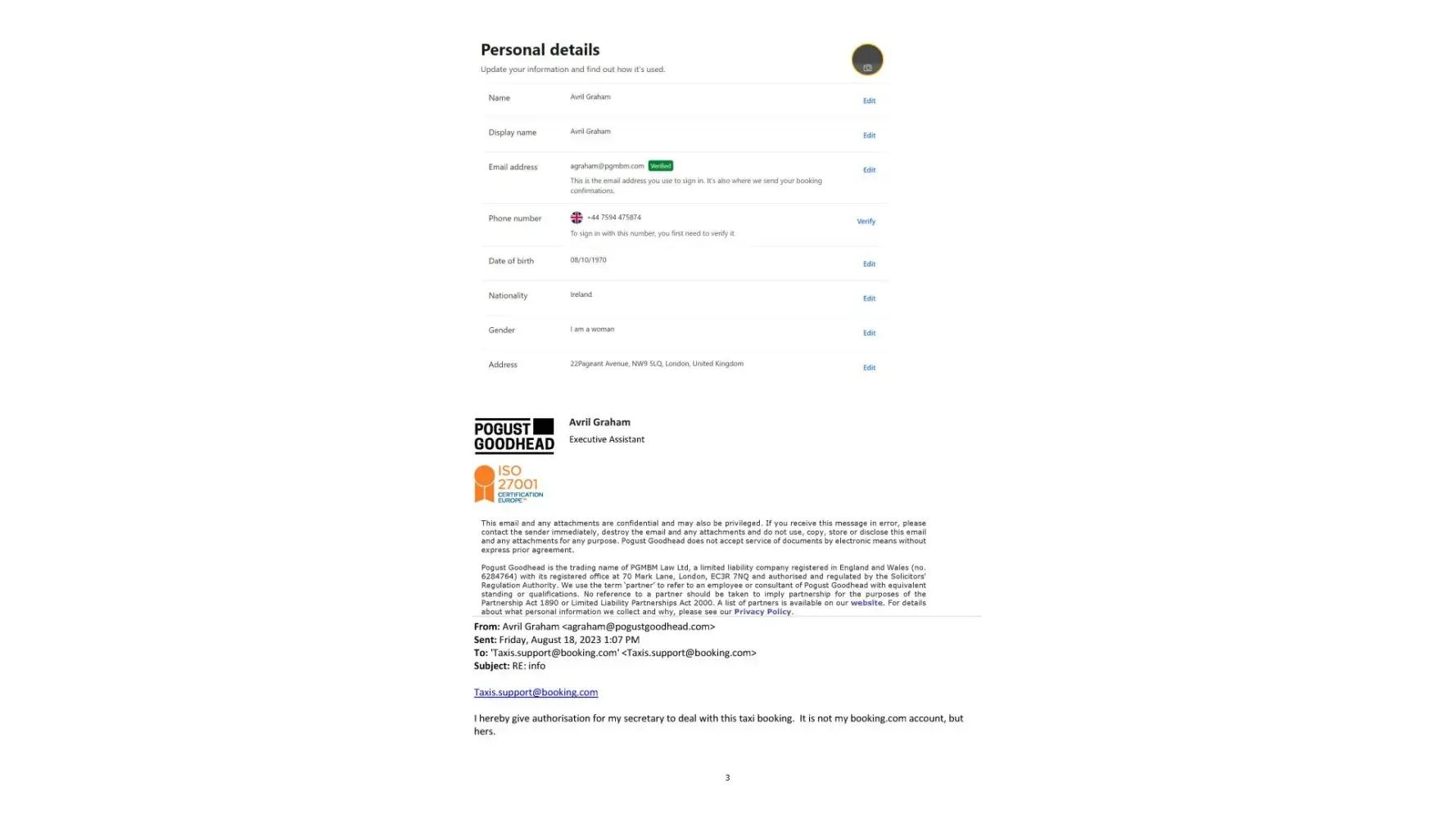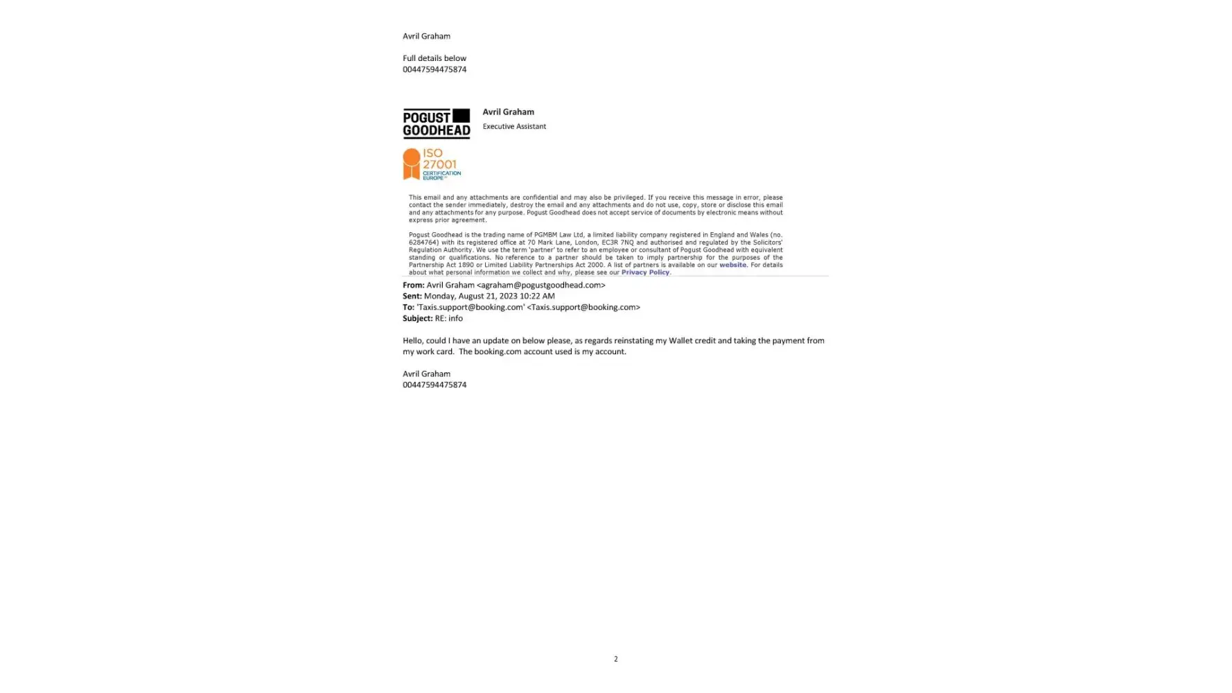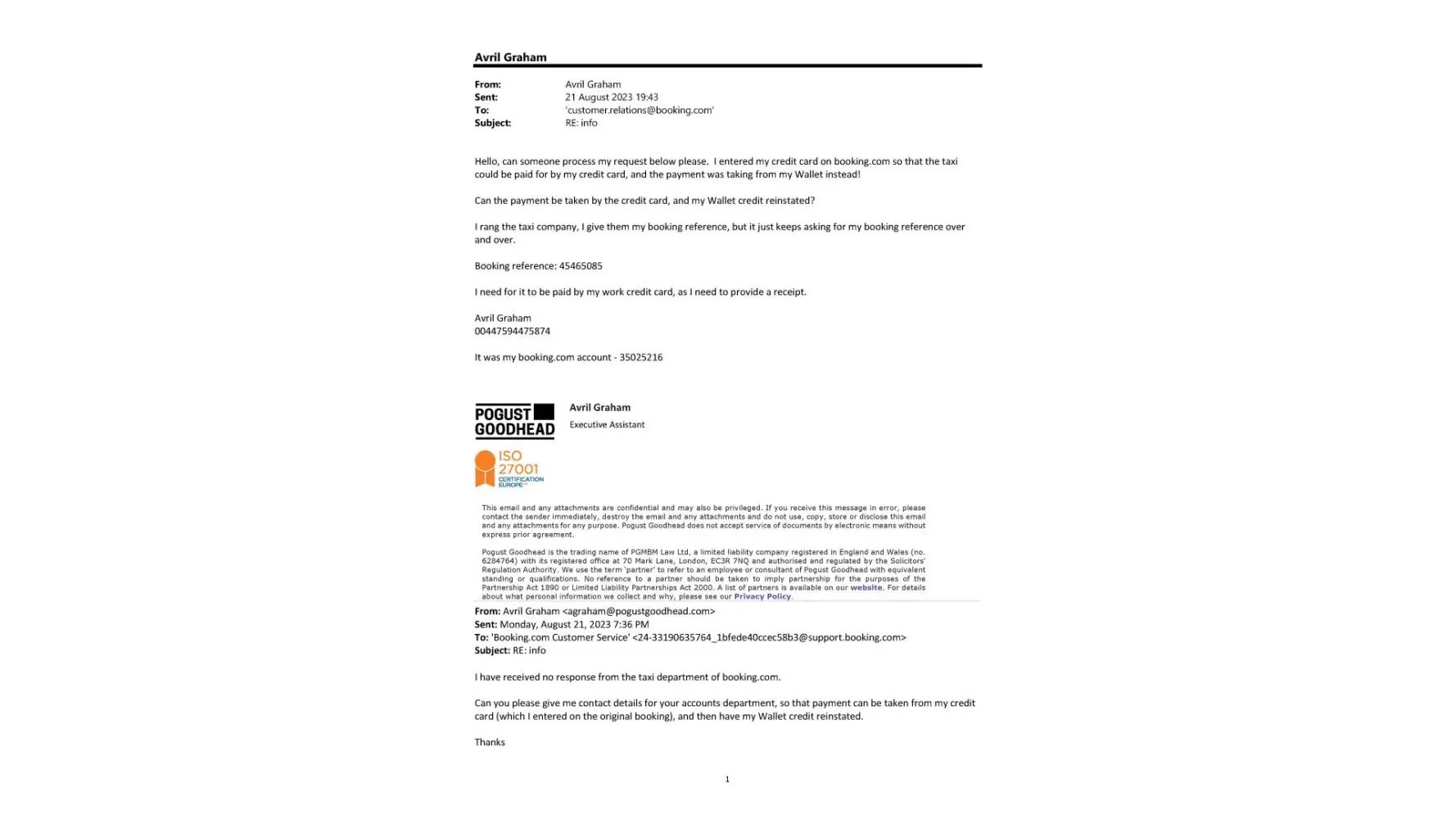 I entered my credit card on booking.com so that the taxi could be paid for by credit card. The payment was taken from my Wallet instead. Can you please take payment from my card. Avril Graham. Tel: [protected]