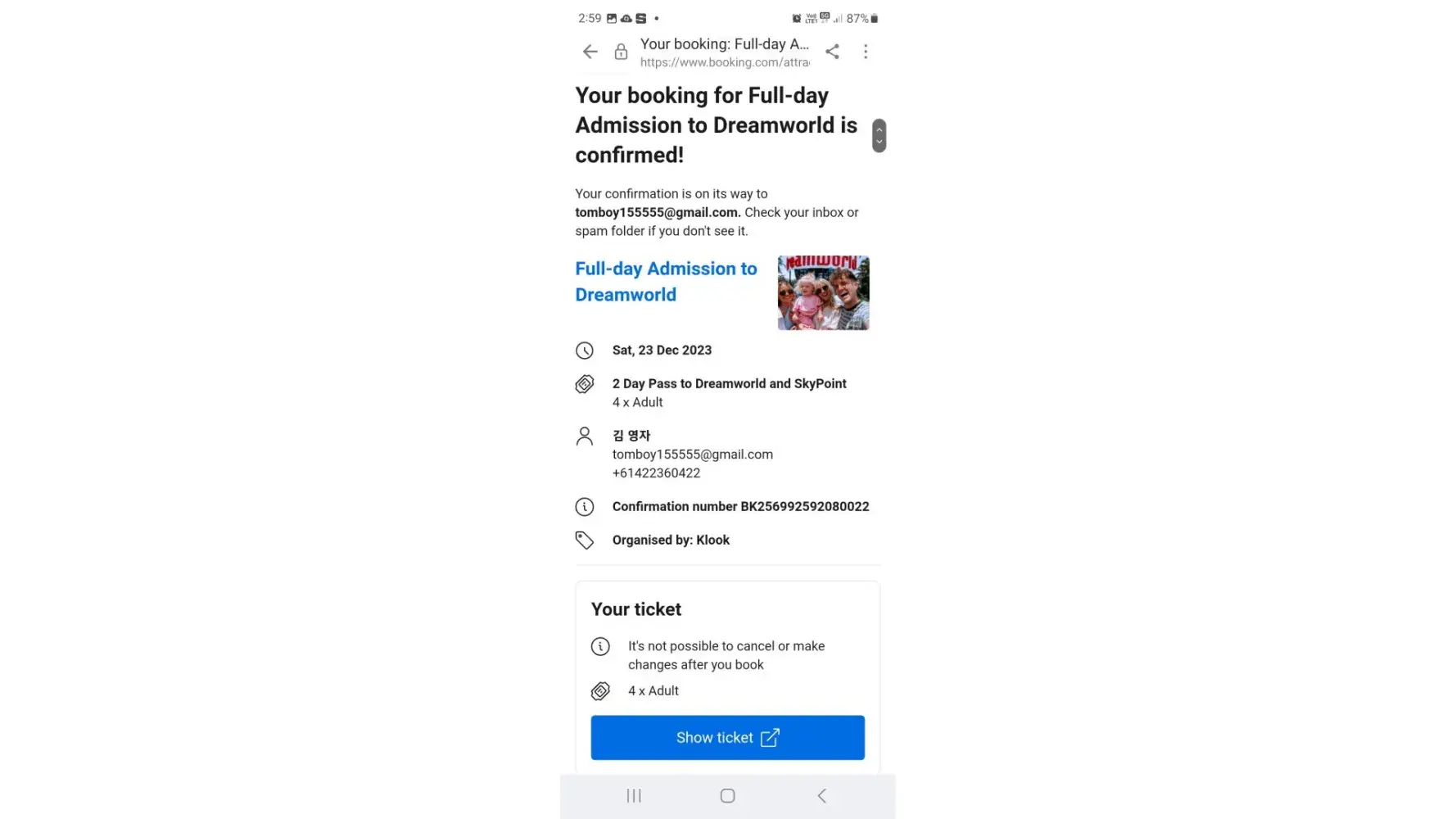 I bought tickets for dreamworld all day at booking.com . On the day we were about to split up, the park was closed due to weather issues, so we couldn't go. We live 10 hours away from there so we asked for a refund but they don't refund us.