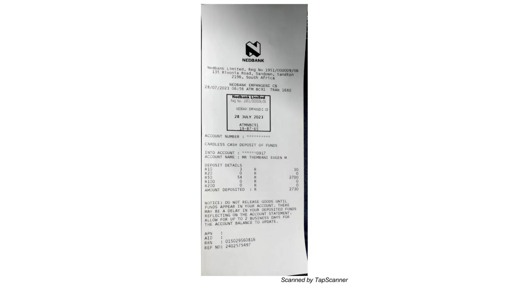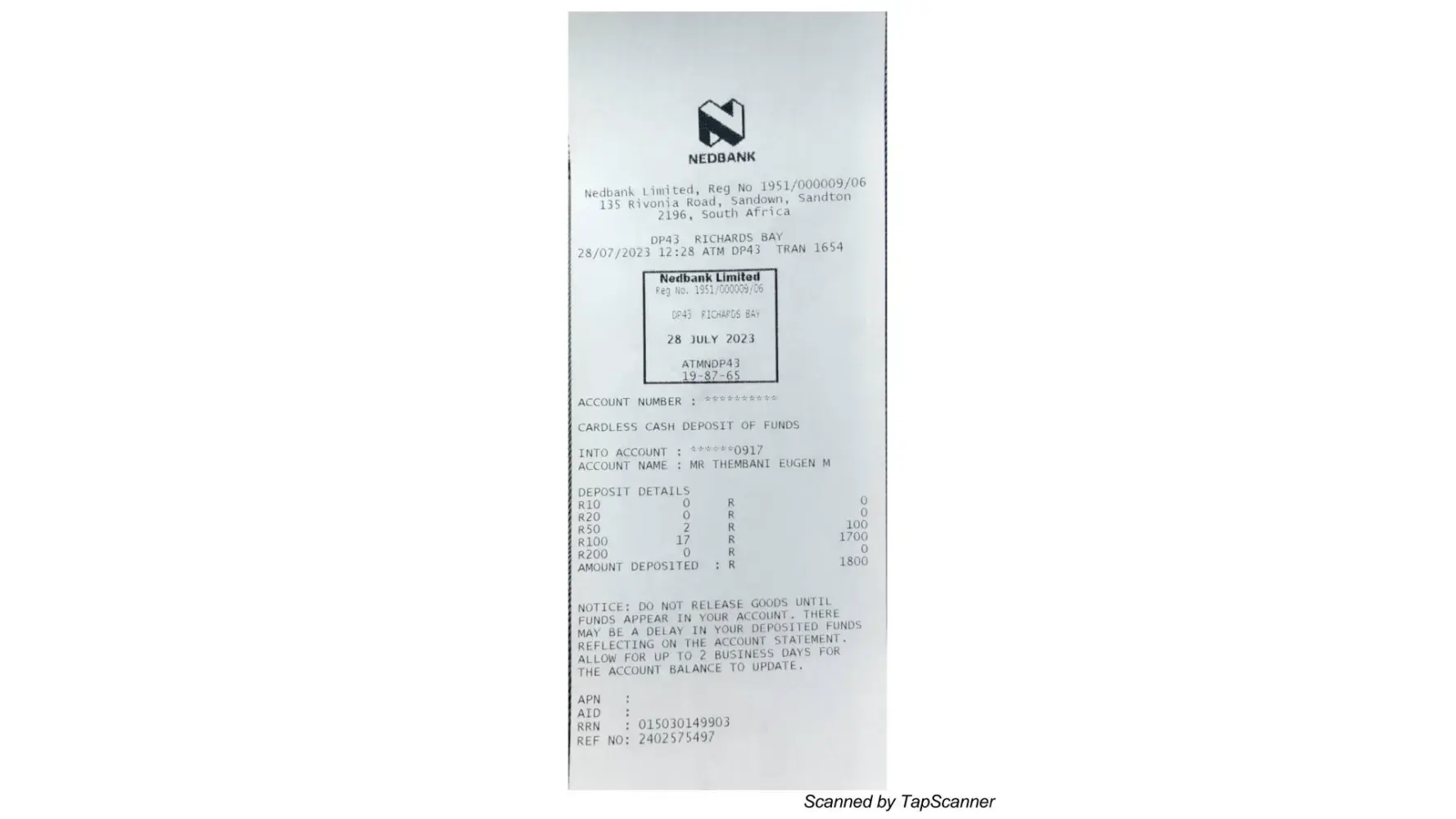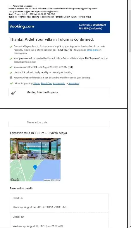 My husband and I booked @TheBoulders Ballito in South Africa via Booking.com app. We booked for 28/7/2023-30/7/2023,3 bedroom apartment of 3 adults and 2 children (11&13 years).Confirmation number:[protected] &Pin number:0344. We went to Nedbank to ask for a refund but they didnt help and we went to nearby police station to open a case and we failed. This whole incident happened yesterday28/7/[protected]@14:50. I'm asking for a refund. We were communicating with these people via Booking.com app and WhatsApp. We use email address:[protected]@gmail.com.