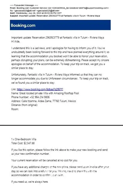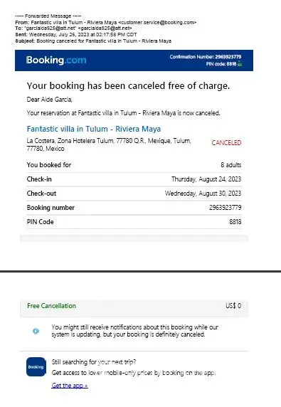 I booked a stay from Thursday, August 24th through Wednesday, August 30th. However, Booking.com cancelled my booking with no explanation. My trip was booked for a group of 10 and we all have our plane tickets and have made plans for our stay in this Zona Hotelera Area. Now we have no place to stay. Booking.com is not willing to accommodate a different location compatible to the original. This was not our fault and feel that they should find us a compatible location to make it right. Please contact me at [protected] regarding this urgent matter.