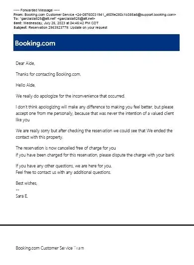 I refer to the headed reservation and subsequent exchanges I have had with members of the booking dot team on the telephone, on your website chat and by e-mail. So far, this matter has not been satisfactorily resolved.