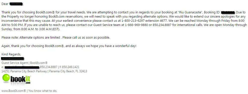 I was called hours before I was to get on my flight, informed that my reservation would need to be switched as the Riu was not honoring reservations (spoke with Riu and they indicated this was not the case). Apparently bookit.com knew about this "issue" for days but waited until the last minute to contact me. I indicated I was going to that specific resort for a wedding and could not be switched to another resort. After waiting hours for a returned phone call, I called them, waited on hold for 40+ minutes and the representative phoned Riu (as did I) and informed me I was good to travel and there would be no issues with my reservation. I arrived and they had called and cancelled it on me. I had to pay thousands of dollars unexpectedly out of pocket, and received no communication from Bookit.com regarding. I contacted them upon my return, waited another 40+ minutes on the phone and had to explain why I was calling for a refund. They disputed the amount, gave me three conflicting reasons as to why and then finally offered to "waive a fee" to send me a breakdown of what they were seeing on their end, as apparently it was different than what I had confirmed in writing. They were unprofessional to deal with, and did not care how much they disrupted my vacation. I have written to their executive for a resolution.