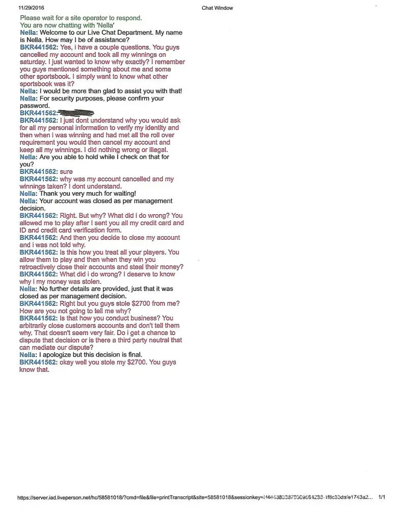 This is the chat log between bookmaker.eu customer service and I. They are rude and refuse to even explain why my account was cancelled and my winnings stolen. I asked why. And they said "per management." How could they steal my money and not even tell me why. They refuse to explain to me why they stole my money. That seems unprofessional. A simple detailed explanation would go along way. They are criminals!