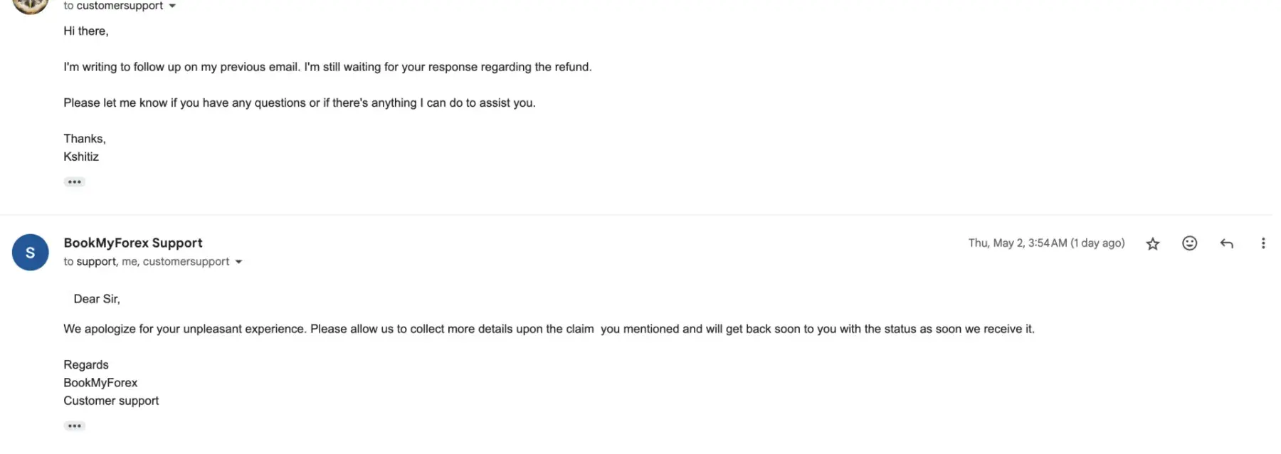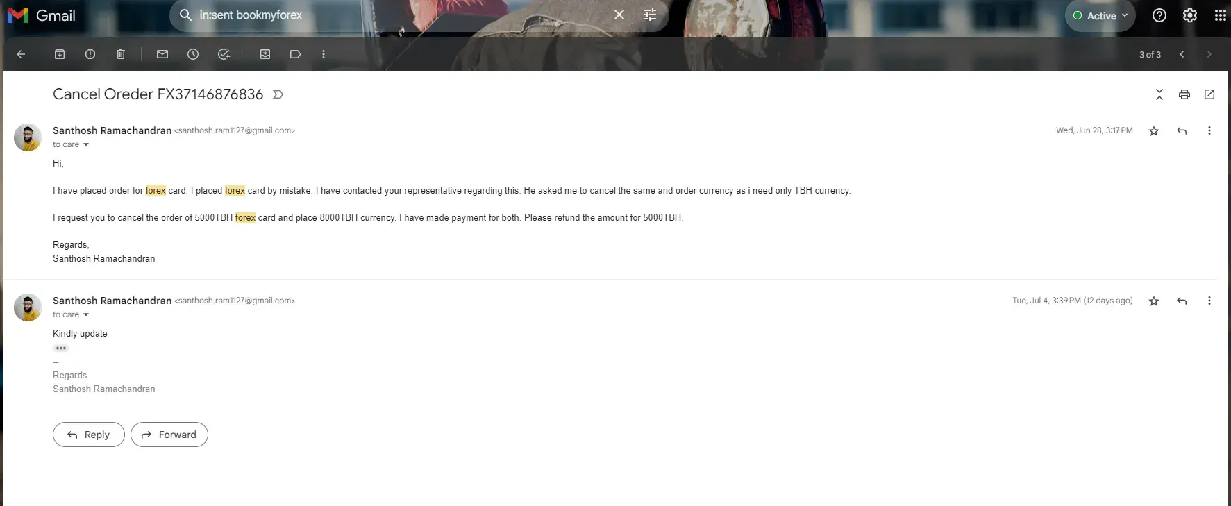 There is no proper response on refunding my previous order of THB 5000 from bookmyforex even after continuous follow-up.
