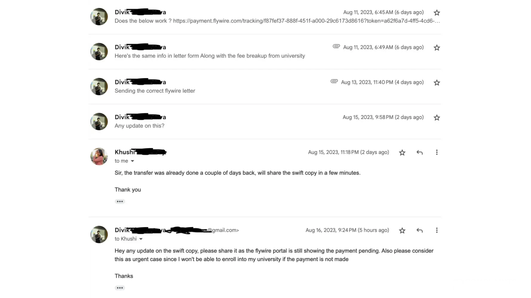 This is regarding order with reference number FX38663653881, for which I already provided all docs and made the payment on the very next day. But very poor communication from your end has resulted in me doubting the legitimacy of the transaction. The payment status on flywire portal still shows it has payment not made, so I request you to either share the swift copy of the payment, or return back all of my money including the lock in charges and all of the fees involved as my experience has not been upto the mark. But I still do hope that the payment was made and with the swift copy, I can still get my payment verified. Please resolve this issue as early as possible as my university is not allowing me to enroll into the courses before the payment is made.