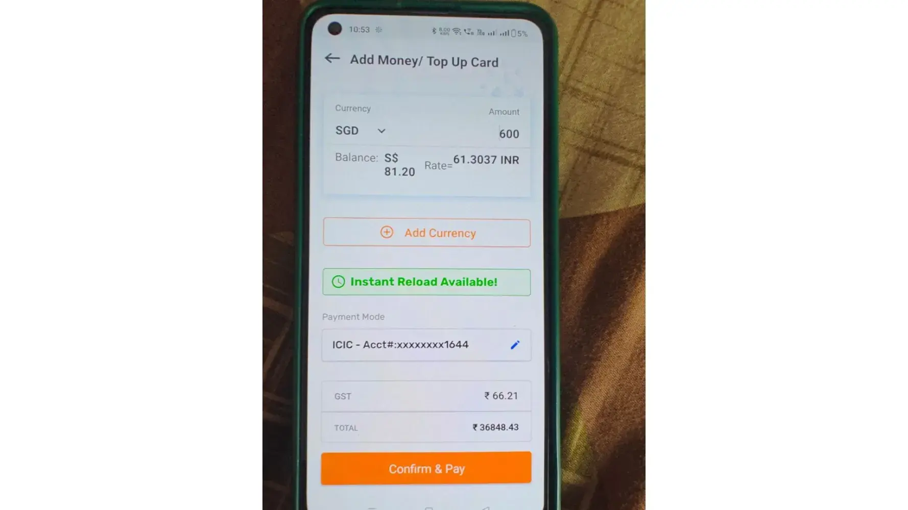 reload of currency (SGD) into forex card