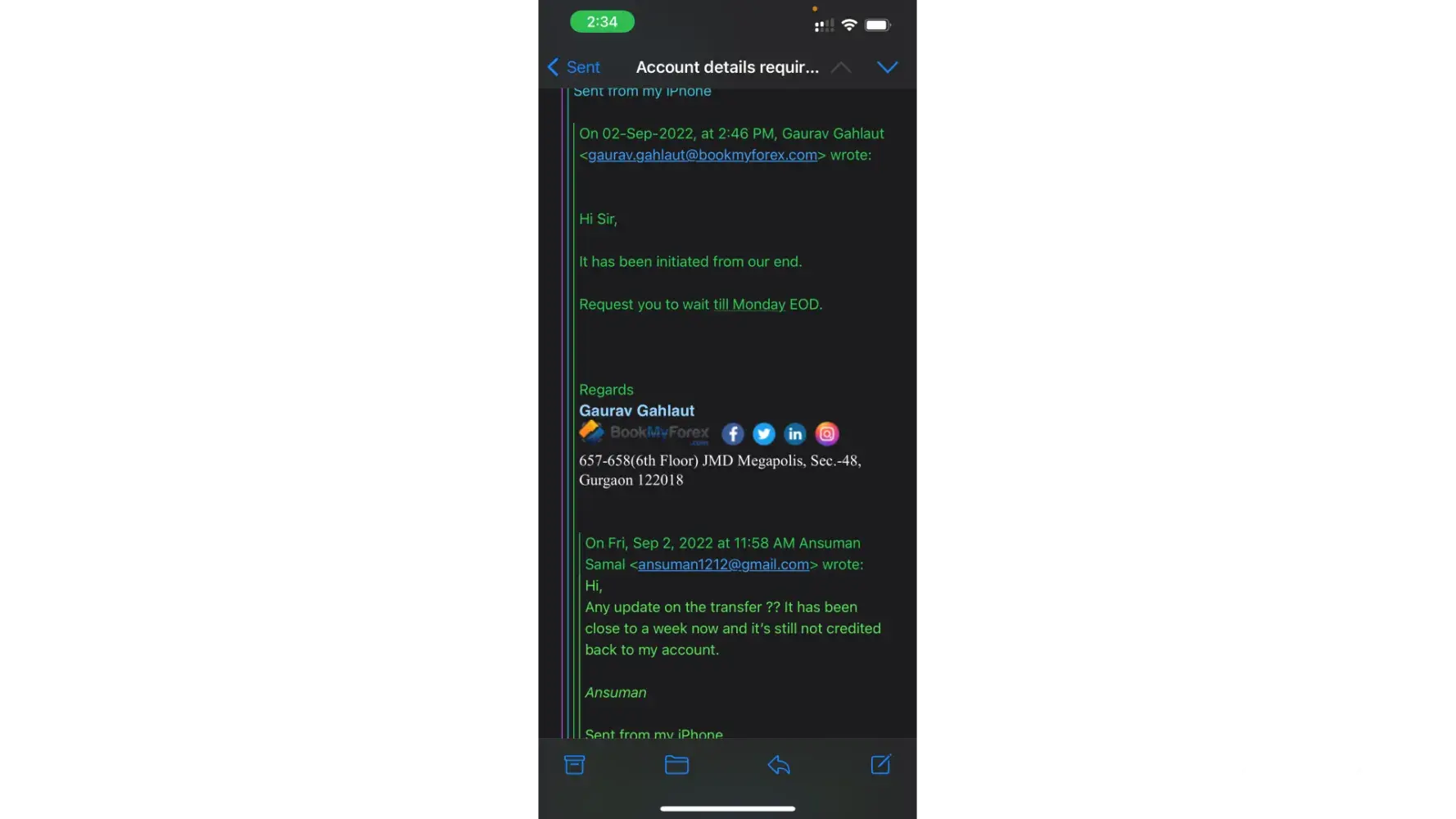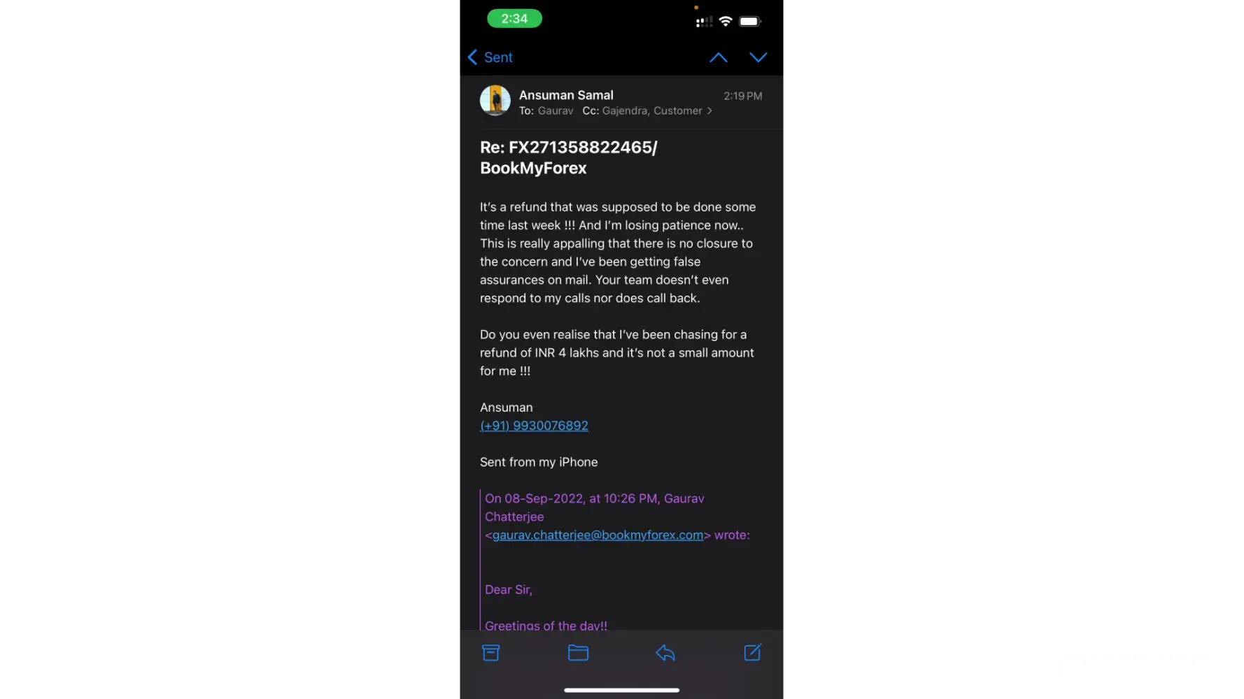 Then an agent from bookmyforex called me on 21st September, 2022 at 6:30pm assuring full refund and asked me to share account details. After that I did not get any information wether the refund was initiated or not, also the transaction number through which i can track. I have sent multiple emails but there was no reply. The customer care is absolutely worthless and is causing distress.