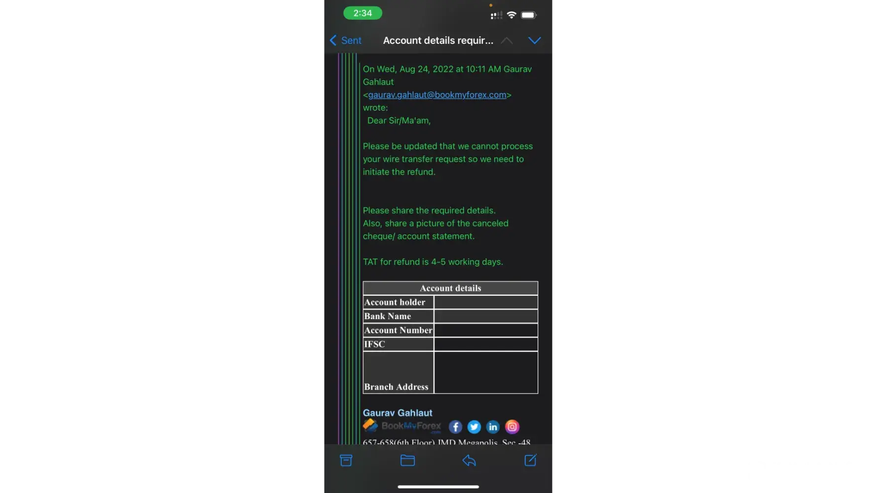 - I shared my bank details for refund on 25th Aug at 8:30 AM