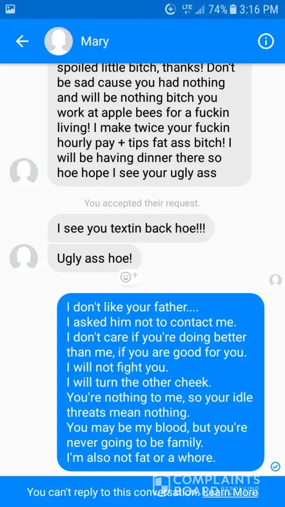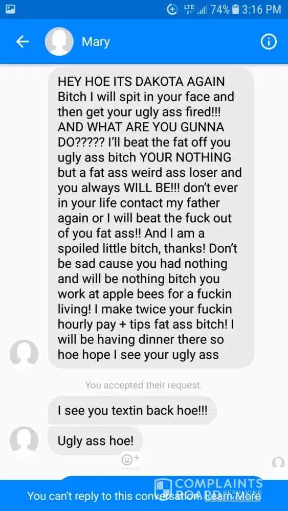 I, unfortunately, am a relative of this employee, and I do not appreciate how this young woman has spoken to me. I've included the conversation. The last two photos are her fake facebook she made, just to harass me.