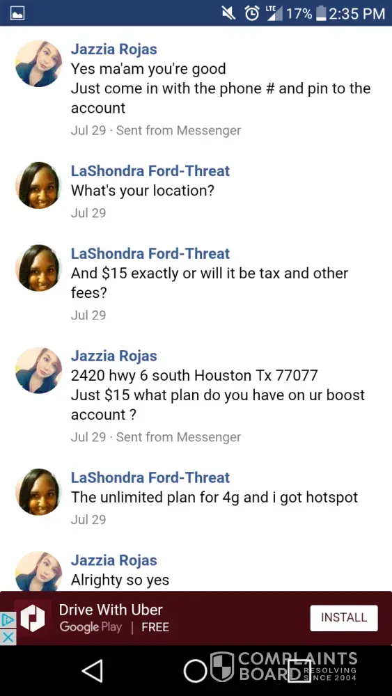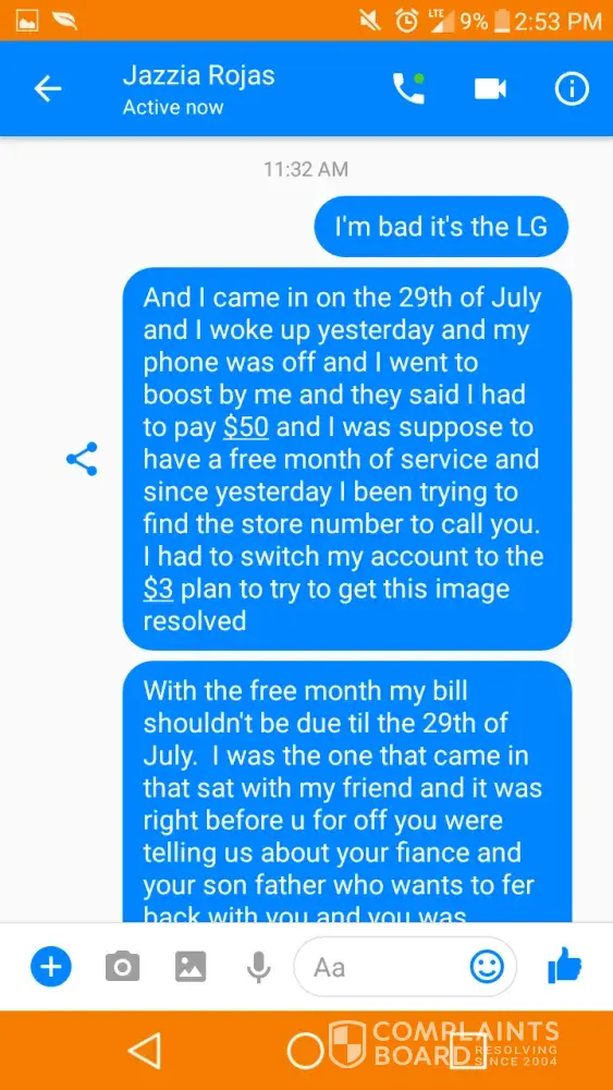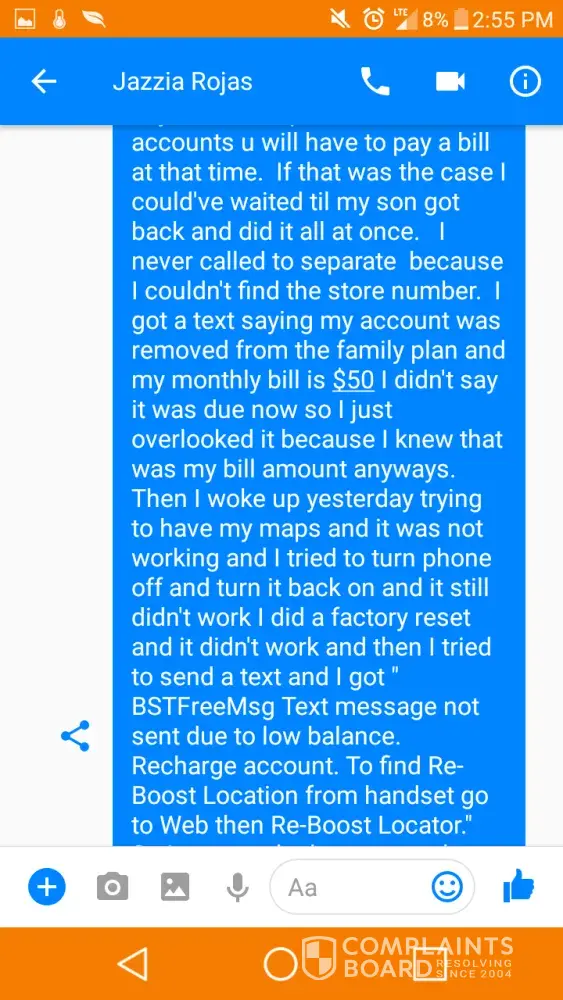 I was informed that the store locsted on hwy6 s was running a promotion all you had to pay was $15 and you would get a free phone and first month of service if you switch over to boost so on sat july 29th i drove 30 mins from my house to this store and was then told the only way i can do it is if im added to a boost account that's already activated i advised her i dont know anyone with boost at this time. She said let me see what i can do. She did something i the computer and said okay you pay the $20 today and your monthly bill will be $50. So im like okay cool. I get a text message that said i was removed from a family plan and my monthly bill is $50. I didnt think anything of it because that's what she told me my bill was and i knew it was not time to pay my bill yet. So today 8/19 i wake up to run some errands and i needed my gps but i would not pull up so i factory reset my phone because i thought something was wrong. But it still didnt work i tried to send a text and i got an error message that said "BSTFreeMsg Text message not sent due to low balance. Recharge account. To find Re-Boost Location from handset go to Web then Re-Boost Locator."