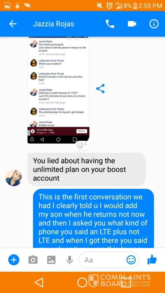 So i went to a boost near me and they did something to the phone and it still wouldnt work so they looked up my account and said my bill was due its 50 and i told them the same as i typed above and the guy their said that sounds like fraud and to contact the store or corporate they can fix the issue and credit your account. But i needed my phone to make the phone calls and so since i only had $20 to my name i switched to the $3 a day plan to be able to use the phone today and tomorrow to try to get thia issue resolved to file a complaint and to get my service back activated with the unlimited plan for the rest of my month to the 29th. And have a $6 credit because i shouldn't have had to do that and i shouldnt have been lied and manipulated just so the store can get a sell this is not right and i need the issue resolved. I asked for corporate number no one will give it to me i spole to like 5 stores on hwy 6 they all say it wasn't their store or its no way to look ot up to sew if it was done at their store. The customer service only noted my account and said they will escalate the issue and some one will get back with me as i explained after tomorrow my phone will be off so i want be able to have my issue resolved. Please help me because my next step will be to contact the BBB and the news. Thank you a very disappointed and highly upset customer. Lashondra Ford