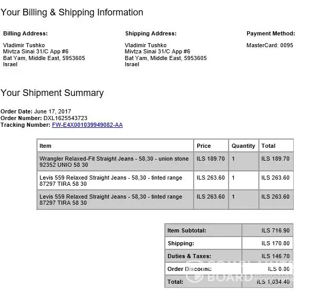 there was no carrier or shipping numbers sent to us, so after chasing Borderfree they say that the order never went through so told us to re-order, which we did and tool another large amaont of money from our paypal account, so paypay informed us that there were 2payments pending in excess of 900usdollars, we again contacted Borderfree and they said they would contact PayPal and release one of the payments, WHICH THEY DID NOT, WHY? because 2 parcels arrived at my house, so 2payments were taken from our paypal account, so we had 2 orders for the same 2 shirts, so
