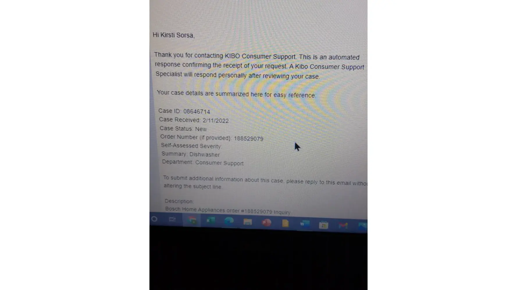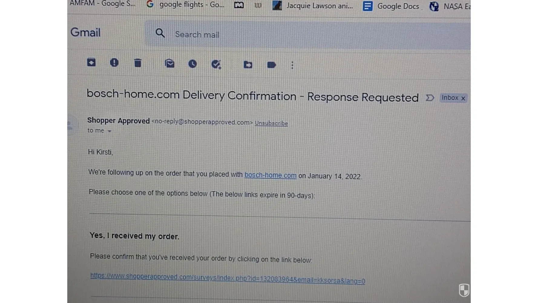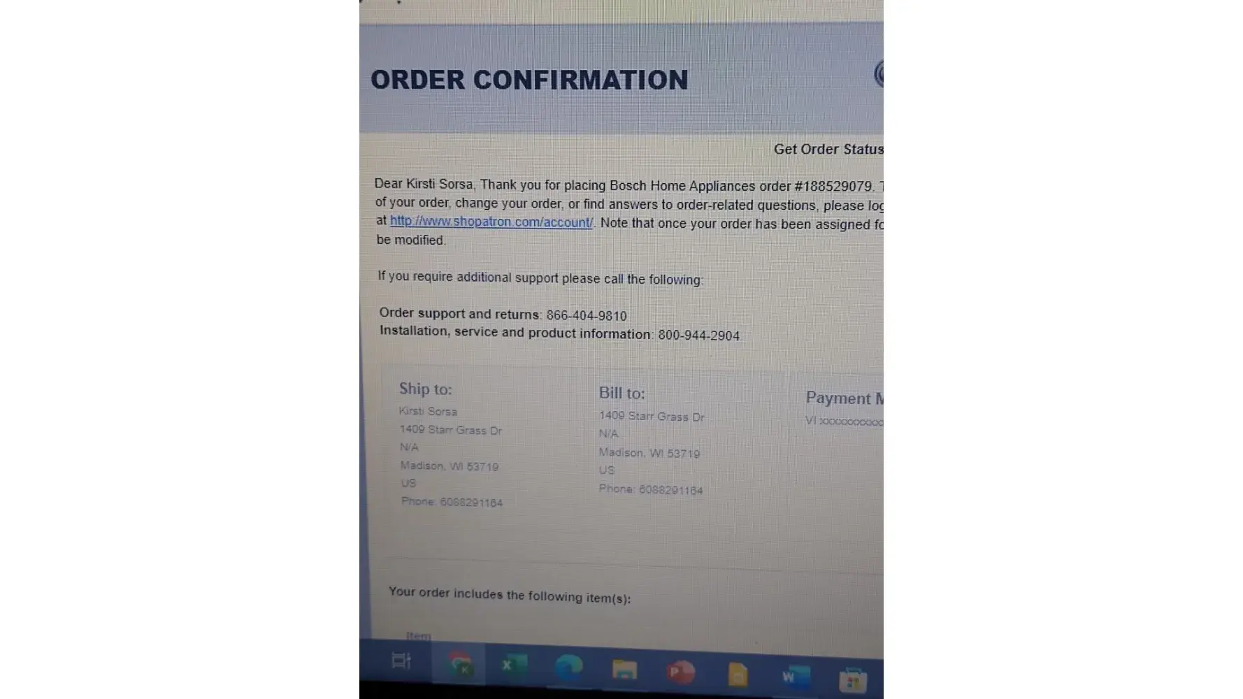 I received Order Confirmation, Bosch Home Appliances order #[protected] via e-mail January 14, 2022 2:15 pm, stating:
