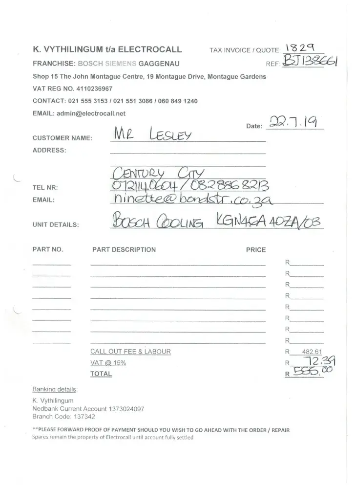 One of my tenants at Oasis, Palm Springs 107, Century City Cape Town, Mr Dyason mentioned +/- 18 months ago that the Bosch fridge /freezer was not cooling properly. The agent at the time, Ninette from Bond Properties requested that Electro call goes out. Carmen from Electro call said a part was faulty and that I had to pay upfront. Which I immediately did. (See proof of payments).