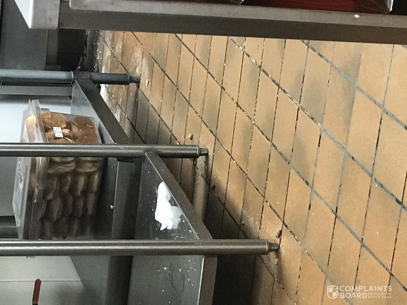 There was a bucket On table in the kitchen along with some other items that was improper and dirty the employees do not care they have a lazy attitude.