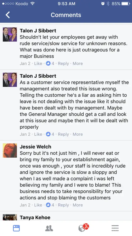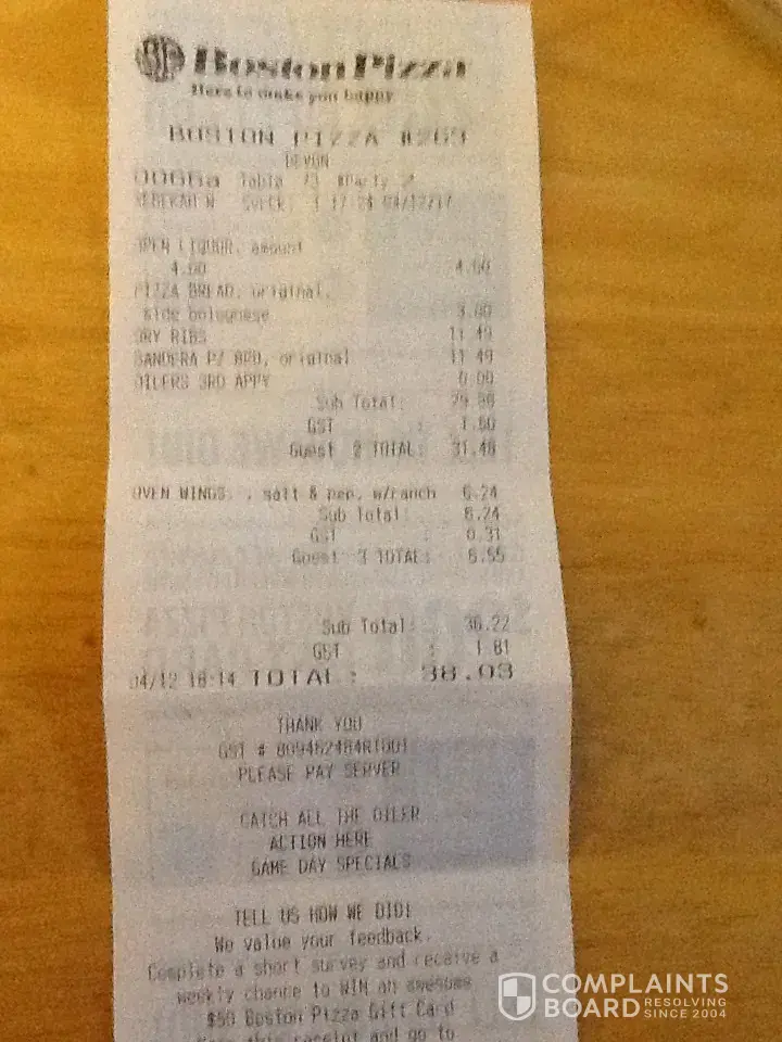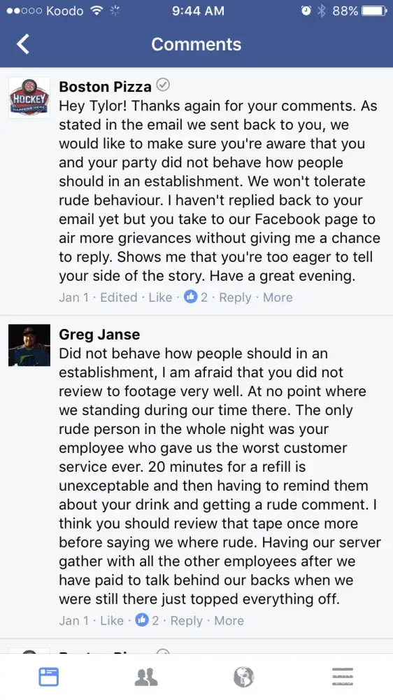 Boston pizza employees being rude over Facebook due to people complaining about the service and food they received. The restaurant kick the people out when they are confronted of their rude and slow services, and try to blame it on the customer. We pay our hard earned money to eat there. And sorry, majority of us don't have time to 'stand on the tables' we have children to watch. Unfortunately this isn't the first time they've blamed customers. I would suggest checking video footage for future reference. It needs to be looked into and something needs to be done.