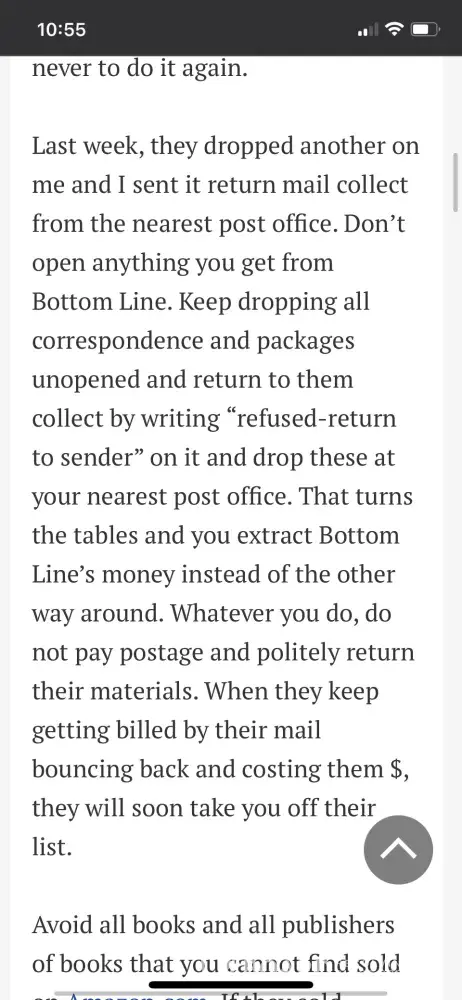 I received a book I did not order. I opened to see what it was and immediately resealed it. Post Office wanted to charge me $12 to return! Tried contacting Bottom Line for a return label and was having to deal with a scam person..HOWLY.COM, trying to charge me $1 and then $55 to take care of this. My bank immediately notified me of fraudulent activity and cancelled that account. I will refuse to pay any bill associated with this book. This correspondence took place on Dec.5,2023 in the evening around 8pm.
