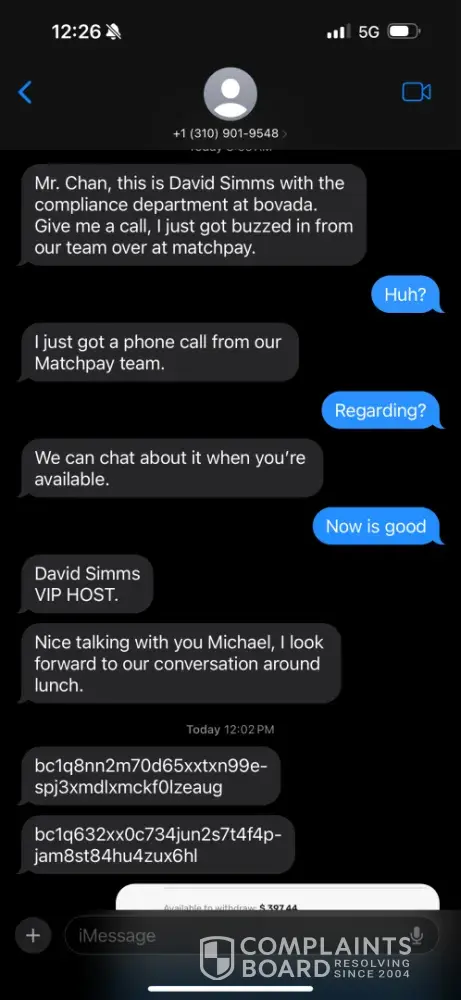 A supposedly bovada vip host contacted me. He reads off my name, address and personal to be legit. He said as a vip host he tells me how to withdraw money since matchpay is full of scam artist and unreliable. He said withdraw money and it never shows up in my account