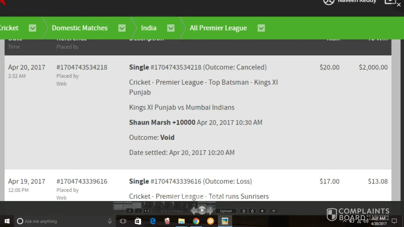 I, naveen reddy placed a bet on apr 19th 10:30pm on a player to be the top scorer of their team, i placed bet on a player name shaun marsh (Odds +10000)