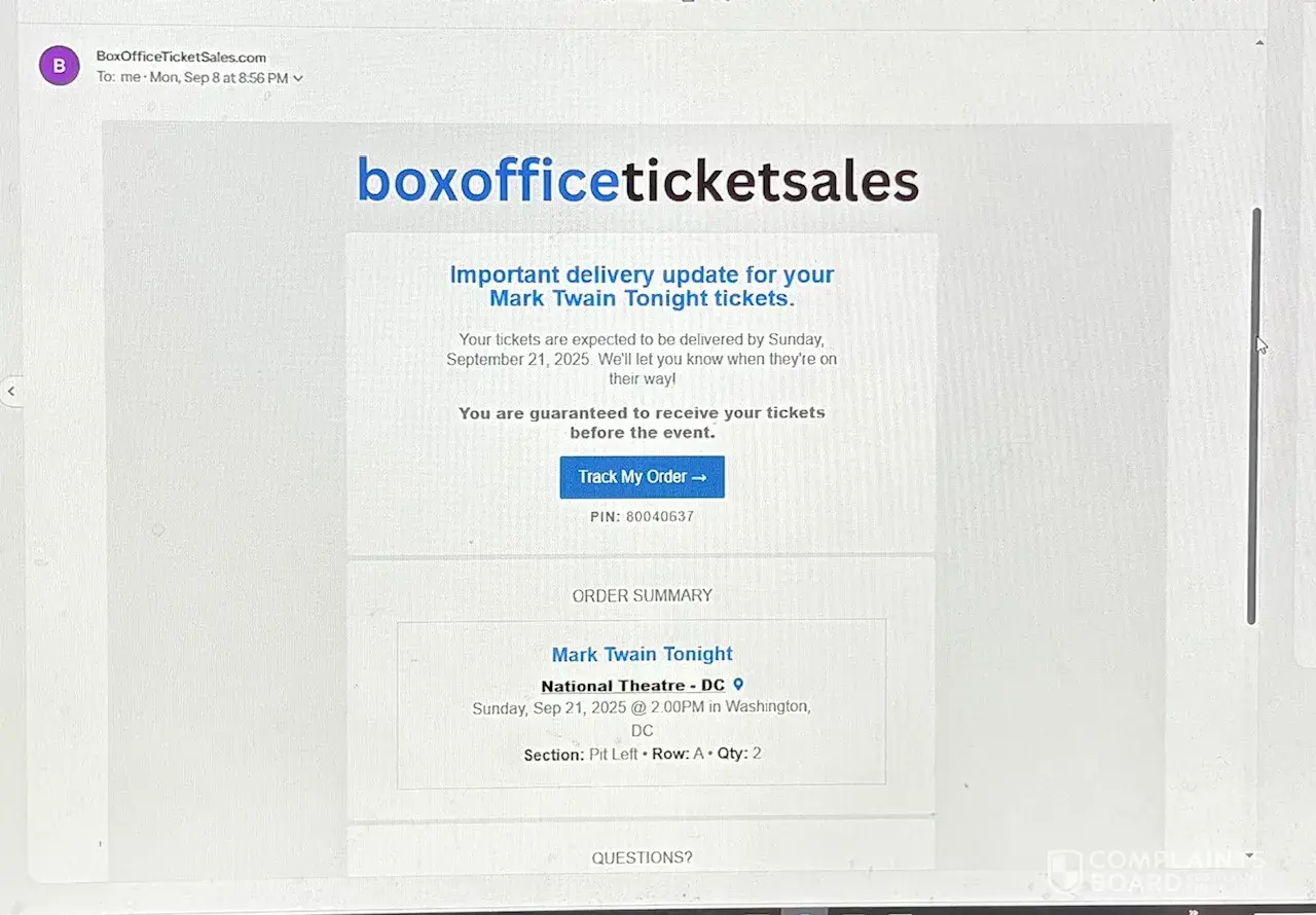 Disappointing Experience with BoxOfficeTicketSales: Late Delivery and Conflicting Information