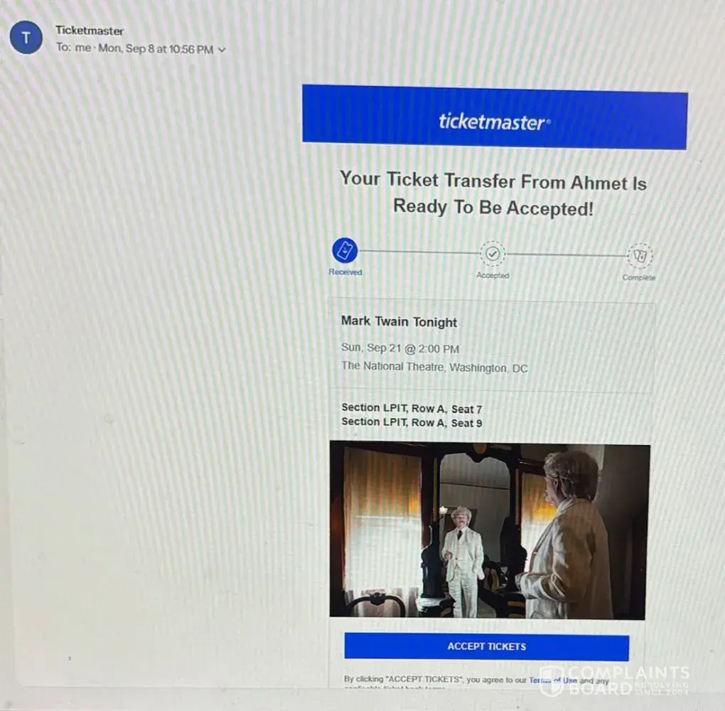 On September 9, 2025, I made an online purchase of two tickets for the National Theater (Washington, DC) presentation of Mark Twain Tonight. The tickets arrived electronically via Ticketmaster, for adjacent seats A7 and A9. One of the tickets (seat A7) was legitimate; the other was for a seat that did not exist – A9! The theater was unable to provide...