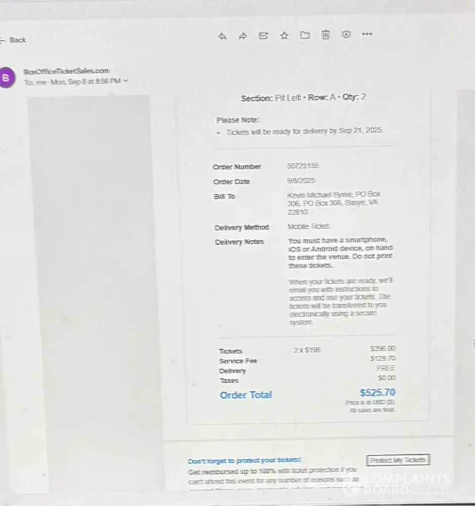 Overall, this whole experience has been very uncomfortable and has ruined what should have been a fun event. I hope that BoxOfficeTicketSales can improve their ticket delivery process and customer service in the future.