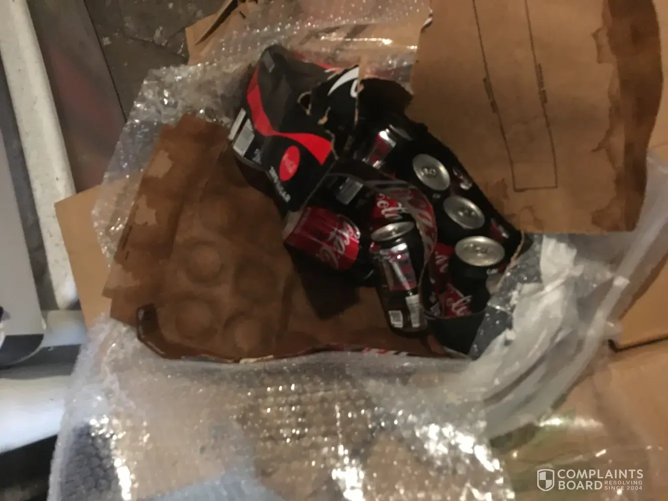I recently made a purchase on Boxed.com for 2 cases of Coke Zero cans, each containing 24 cans. I decided to split the payment between a gift card and my credit card. When the package arrived, the box appeared to be in good condition. However, upon opening it, I was disappointed to find that the top case of soda was leaking liquid, causing all the cans to be drenched in soda. The box had become soggy, and I even found one can that was still sealed but empty of liquid. The second case underneath was intact, but it was a hassle to open everything that was dripping wet. I have attached a photo of what I found when I opened the box. Although I was able to salvage most of the cans, it was frustrating to have to spend half an hour wiping off cans of soda. The last thing I wanted to do when I got home was to bring a leaky box into the house.