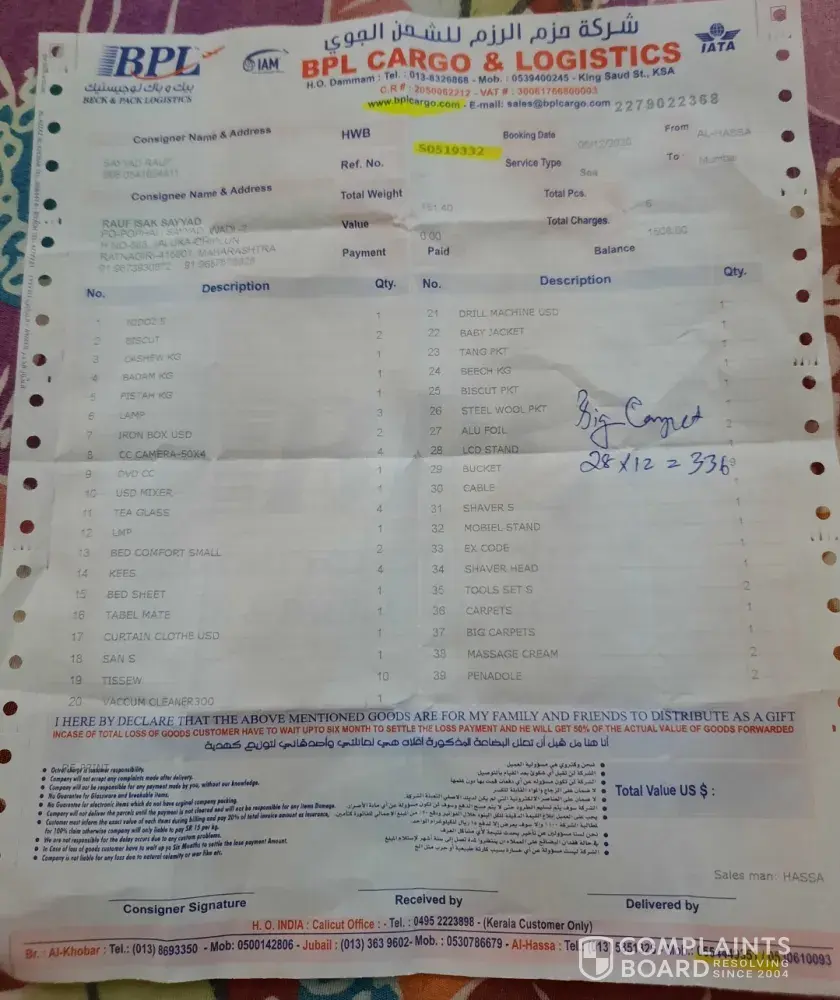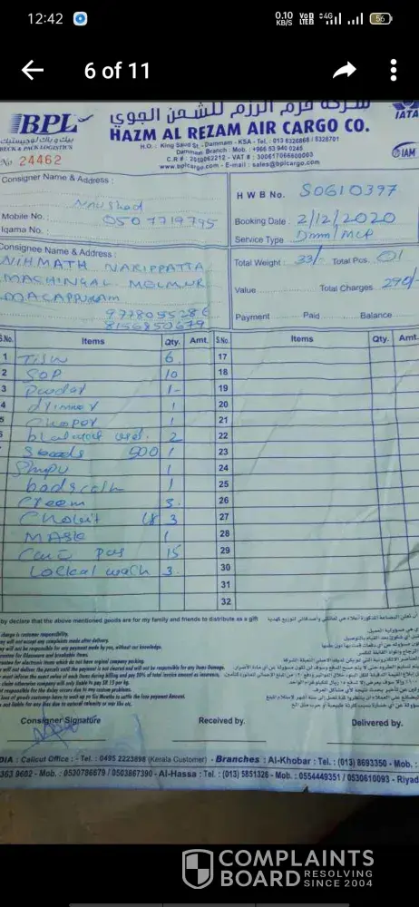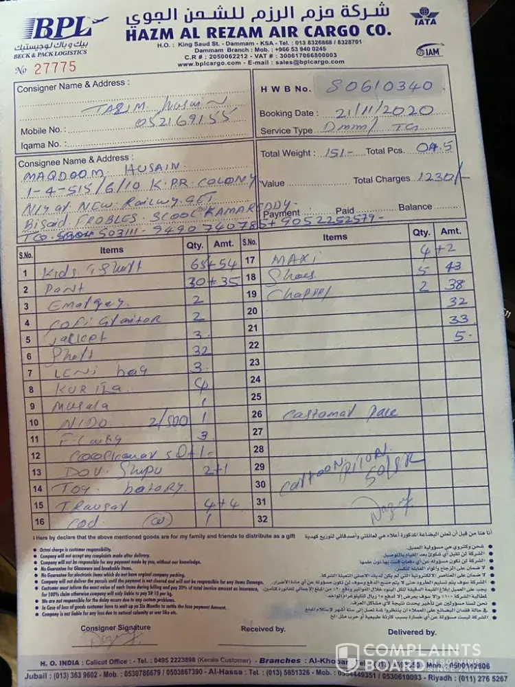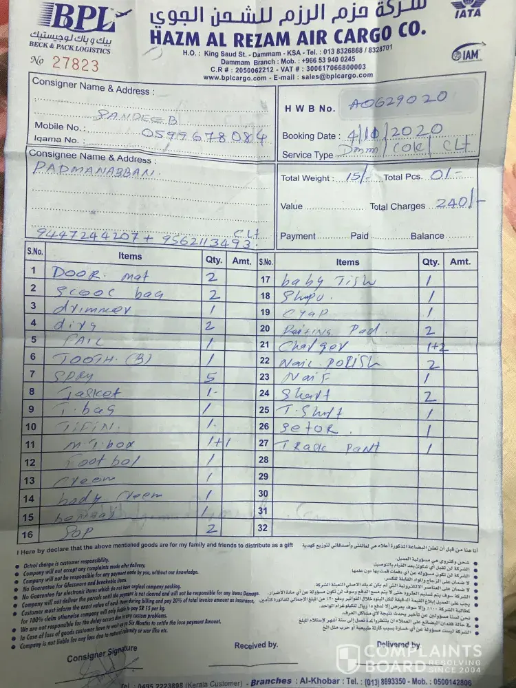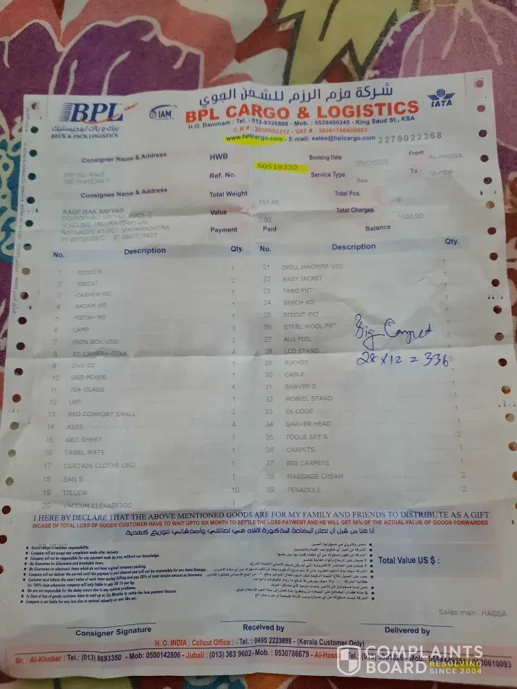 I am speaking from saudi arab Damam Al Hasa. We sent some goods from BPL. Cargo on 5 December 2020.  It has been 4 months so far. So far, some things have not been found at our house, so we want you to help 🙏🙏🙏