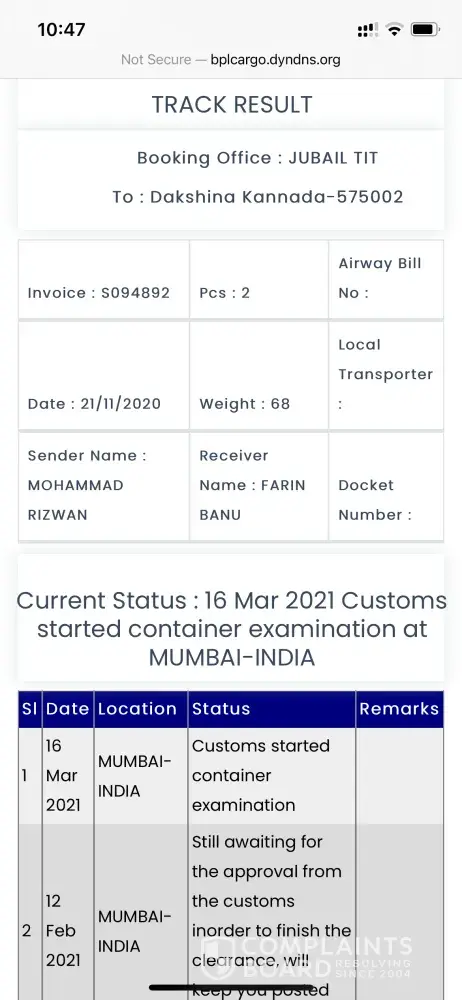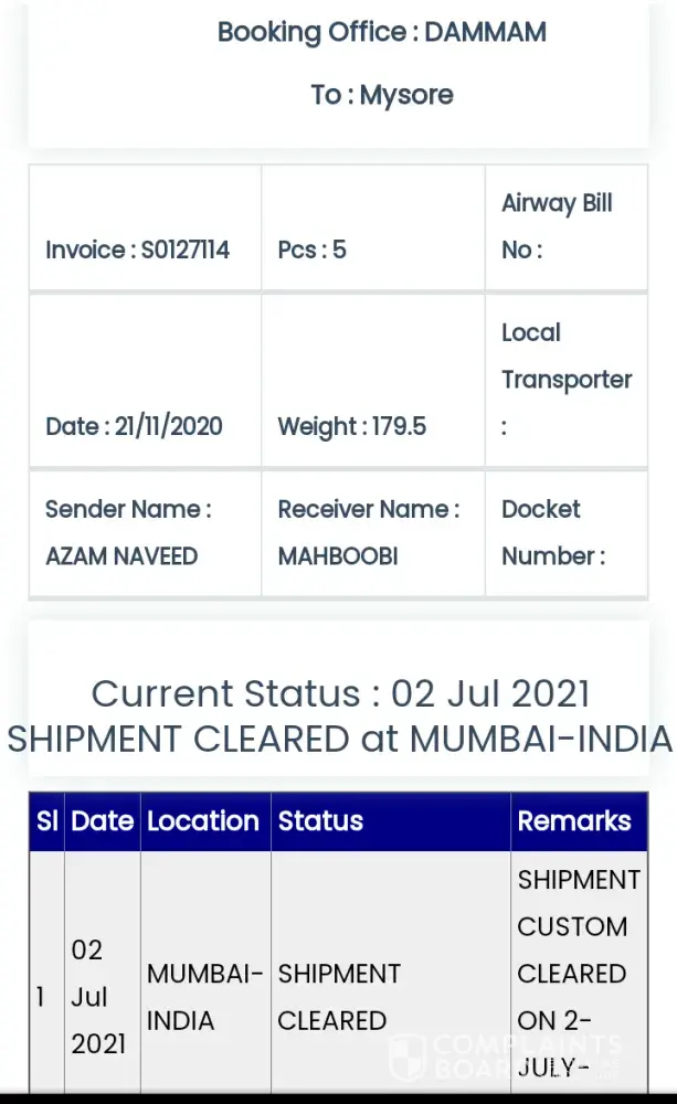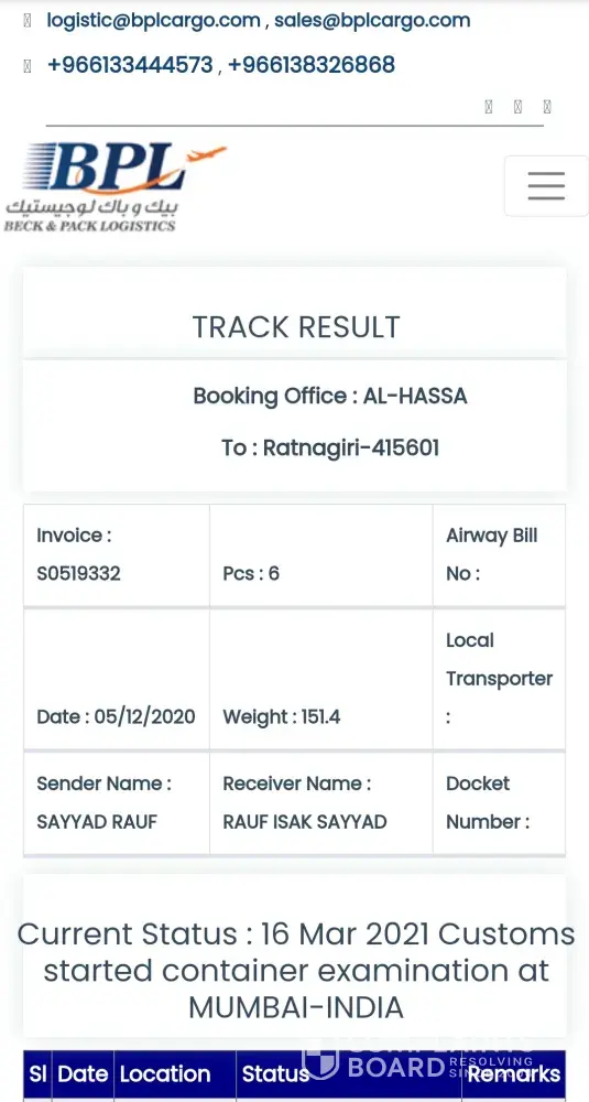 BPL Cargo / BPL Company Invoice number S0127114 from Dammam to India - Karnataka Mysuru - I didn't receive my Cargo since November 2020