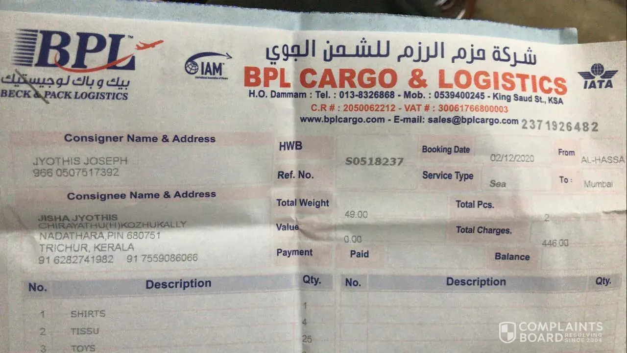 BPL Cargo / BPL Company has left an official reply on this complaint.