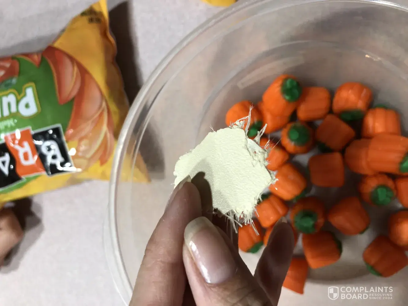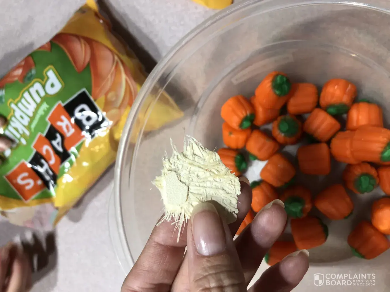 I purchased a bag of pumpkins and when I poured it into the bowl to make a fall trail mix a big chunk of something came out. It looks like some kind of wall or fiber board painted white. It is larger than a fifty cent piece. I was shocked and disgusted. I have attached photos. I thought it best to notify you for safety reasons. I included information from the bag. What could this be? I would like a reimbursement at the very least. Thank you.