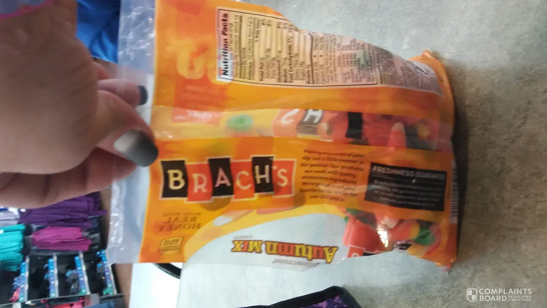 I look forward to buying this product every year around this time...however this time I purchased a bag of the product and was very disappointed. I selected the "perfect" bag or so I thought. Perfect meaning that because I prefer the candy corn and pumpkins the most and the only way to get both together is to buy the Autumn Mix. Well when I saw this specific package on the shelf it immediately caught my eye as it had mostly these two favorites in it with very few Indian corn which I thought was great. So I proceeded to check out and purchased them. To my surprise when I sat down to open them I noticed that the bag was less than 1/2 full with the rest being air. What shocked me about the quality was that on the package I bought it specifically said Over 60% More servings than the leading national size of Brach's. So I wanted to bring this issue to your attention. I completely understand that most packaging is done by machine nowadays so it could be quite possible that this package could have been one in a million to get filled up less than normal. Thank you in advance for your time.