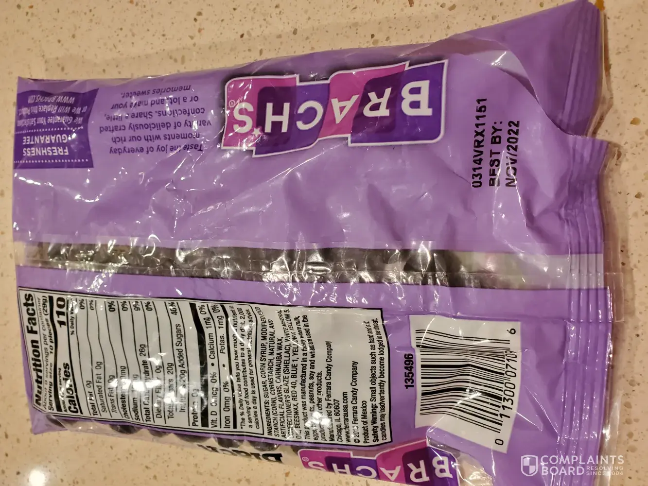 Desired outcome: refund or replacement coupon for a 20 oz. bag of Brachs candy, NOT Maple Nut Goodies