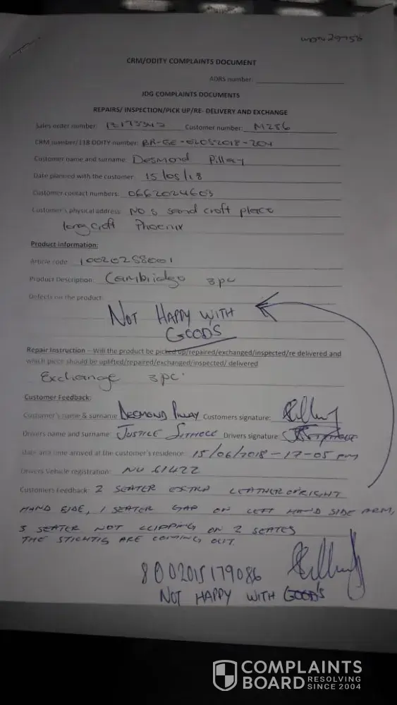 On 15/06/2018 a second set was delivered which disappointed me even feather reason being there are a number of defect on all three pieces, Which is listed on the CRM/ODITY complaints document from the delivery person which is found in attachment. Has a customer a followed protocol and once gain logged a complaint with my sale rep only to find out that the same principle apply which will in-convenience my family and I.