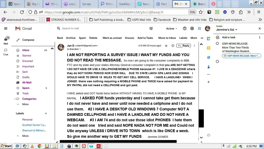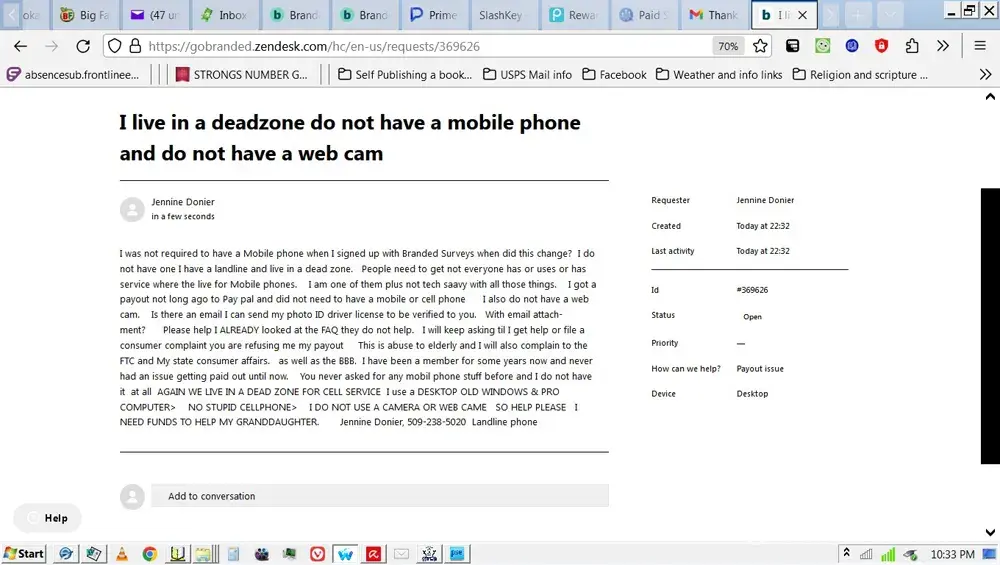 I joined Branded surveys via an invitation about 4-5 years ago and never saw anywhere we had to use a cell/mobile phone. I do not have or use a :Smartphone" I live in rural mountains of Eastern Washington 25 miles from Spokane and in a wildlife refuge area which has a moratorium due to the EPA against putting in any Cell towers in the area. So over 5200 residents use landlines and only use cell phones in town. We have centurylink landlines. I have a basic cell phone not one with all the whistles and bells on it for use in town for emergencies. No camera no internet etc. It is old but works I am 74 and not into or want to have a smartphone they just confuse me and I do not text or anything/ I take surveys online at home to earn a little extra income a month to supplement my social security check so I can help grandkids and buy gifts. I have twice before asked for payment from Branded Surveys and neither time was asked for a code or cellphone number. Now suddenly when I needed money to help a granddaughter with gas money as she is planning a short trip They demanded a code and cellphone. I don't have nor use. They have got nasty and blocked me from access to my survey profile and account unless I give them a cellphone number I do not have nor use. I have a landline other surveys, Facebook etc allows me to have a landline and sends me an email with a code to put in or calls my landline with a code Branded Surveys needs to do the same. YES they KNOW I am 74 it says so on surveys at the bottom of the page They refuse to pay me $50.65 I have earned the past 4 months. I plan to notify the BBB the FTC and both California and Washington State Attorney General consumer affairs this abuse and illegal. I just want my money and then they can delete my account don't need snotty rude little brats acting like they are superior and nasty. Done once I get my money. I will also notify everyone on my social media accounts, Twitter, Pintrest, MeWe, Facebook Linkedn and Nextdoor. Angry old lady being cheated and bullied. Jennine Donier HELP See screenshots. UGH IT WON'T LET ME ADD 3 more screenshots proving my case UGH UGH UGH Keeps saying error these are important