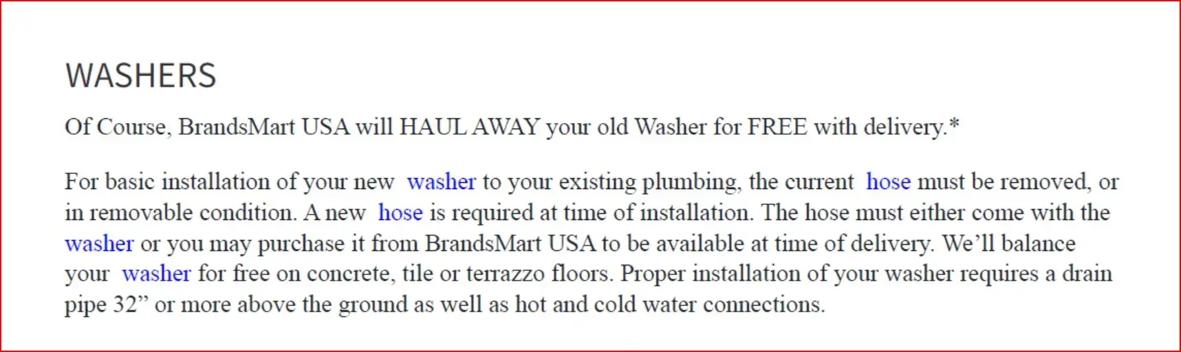 Today, December 29th I was finally able to contact a representative from Brandsmart to query whether an exception might be able to be made to the 30 day return policy as my purchase was made in early November and remained boxed until yesterday. As I was unable to find a plumber and then an electrician to add the plumbing and electric required for this washer and dryer due to it being the holiday season and they were all backed up with jobs. Both insisted on the unit being present in order to view what had to be done. Appointments were cancelled, due to their jobs running late and behind. This was out of my control and the units remained boxed in the middle of my living room until yesterday. The units when unboxed are far too large to fit into the required space. I called Brandsmart and received the policy info on returns. I asked for an exception due to my circumstances, finally being connected to Sonia, a manager. She showed poor customer care and reiterated the rote reply of the prior representative. I am sorry that the "personal" touch has been lost in this company, or perhaps never existed. I will not be purchasing from Brandsmart again.