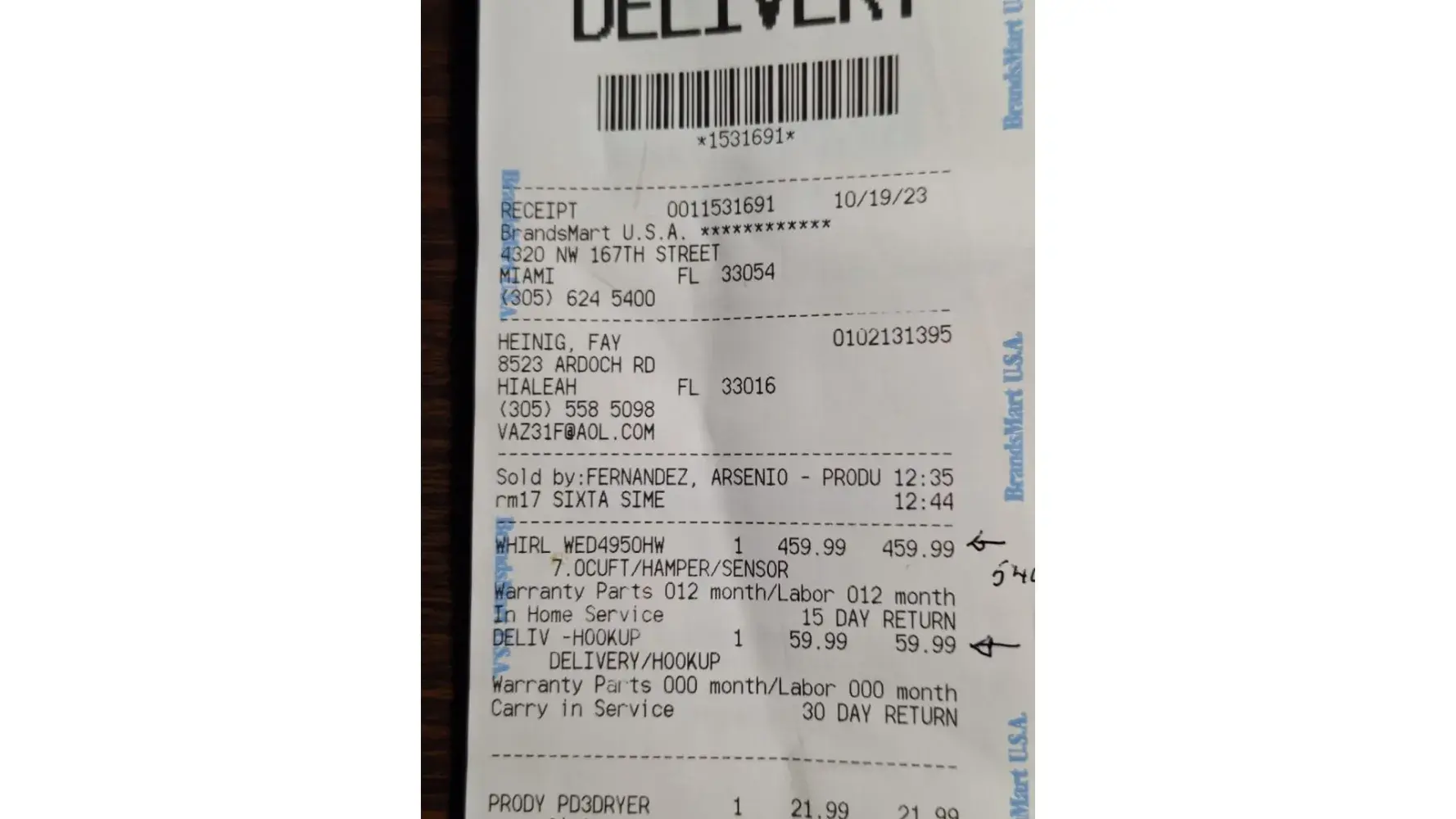 This Dryer was delivered to my home at 8523 Ardoch Road, Miami Lakes, FL,
