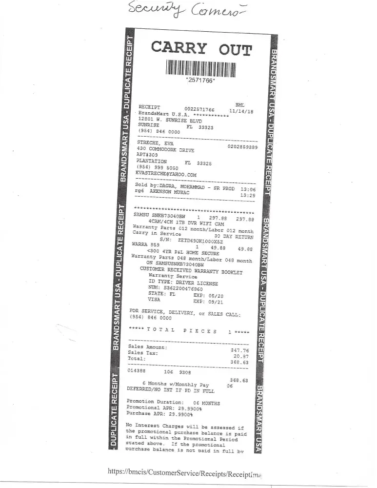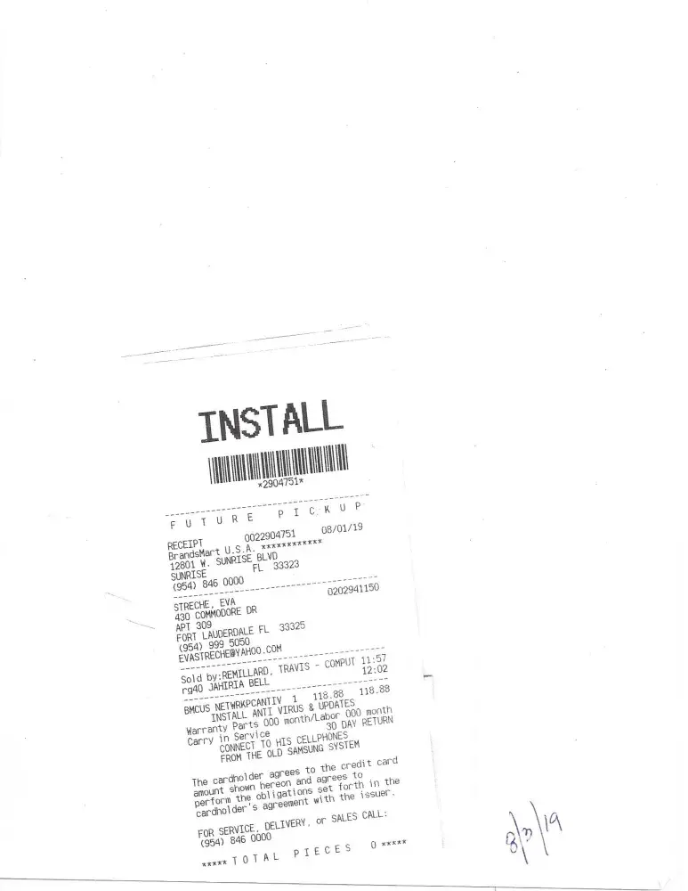 On 8/3/2019 a technical support from Brandsmart provide service to 430 Commodore Dr. Apt. 309, Plantation, Fl .