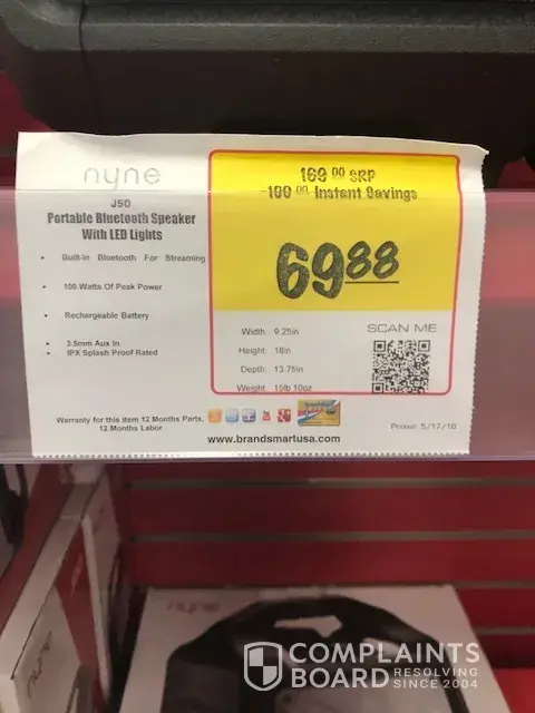 On June 5, 2018, I went to the Brandsmart Store located at 751 Executive Center Dr, West Palm Beach, FL 33401 with my family looking for a Bluetooth speaker. After looking at a several speakers I found the specific item I was looking for. I saw a J50 Portable Bluetooth Speaker with LED lights, marked at $69.88.