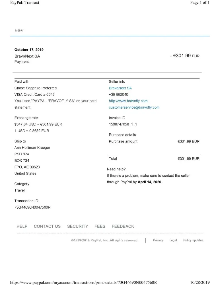 And you replied with a quotation for the change requested, modified date now is December 26, 2012! Why is it 2012? so I concluded there must be a system error on your part. Much more you are charging me of 1, 247.99 Euro. I did not confirm the quotation, instead I emailed Bravofly to make a complaint at 9:05pm same date Oct. 27, 2019.