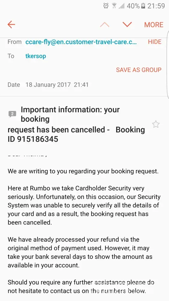 I recently booked a flight for x3 family members using my credit card.The amount was debited from my account, however I was sent an email from bravo fly stating that they could not verify the card details there cancelled the booking!