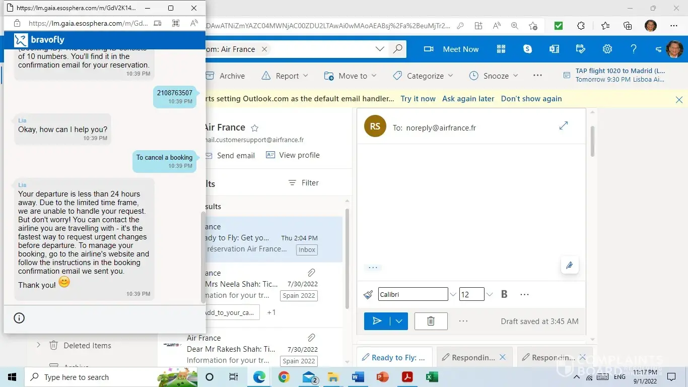 I have been trying to reach Bravofly since yesterday. During Chat, they advised me to contact Air France due to short time to flight. Air France insists the I deal with Bravofly. There is no way to contact Bravofly and many attempts to cancel on the website failed.